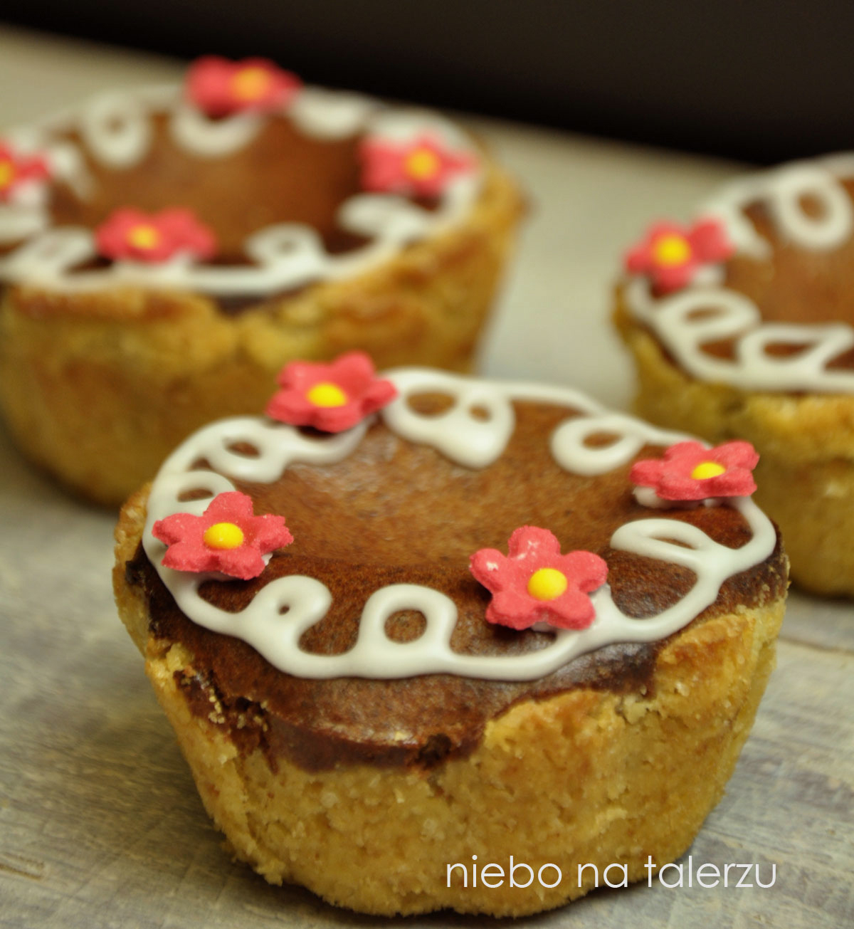 Wszystkie składniki zagniotłam szybko ręką na gładkie ciasto.Gdyby było zbyt sypkie i składniki nie chciały się połączyć, dodaj odrobinę wody. Formy do babeczek (mogą być też te od muffinek) wysmarowałam dobrze masłem i posypałam tartą bułką. Z ciasta odrywałam kawałki wielkości małej mandarynki i formowałam małe placki. Wylepiłam nimi foremki. W przypadku muffinowej, głębszej formy, ciasto proponuję wylepić do polowy wysokości. Czekoladę połamałam, dodałam masło i podgrzałam na małym ogniu, dodałam śmietankę, cukier, kakao. Ser zmiksowałam blenderem i dodałam do niego ciepłą masę czekoladową. Wymieszałam dobrze łyżką. Ubiłam pianę z białek i delikatnie wmieszałam do serowego ciasta. Nałożyłam do foremek. Piekarnik rozgrzałam do 180 st. Myślę, że dobrze byłoby wstawić formę do większej blaszki napełnionej do 1/3 wysokości gorącą wodą. Ja o tym nie pomyślałam i moje babeczki nieco opadły i popękały. Niemniej, wyszły bardzo, bardzo dobre. Lukier włożyłam do dekoratorskiej tutki i wykonałam esy-floresy.