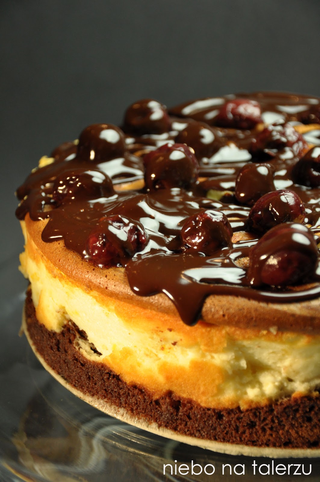 To ciasto podobne jest nieco do sernikobrownie z wiśniami, tylko zamiast warstwy sernikowej ma puszysty, jogurtowy wierzch i najlepszą na świecie, błyszczącą, idealnie pasującą do wiśni polewę. Jest delikatne, rozpływające się w ustach, pyszne i wygląda bardzo efektownie. No Wiśniowa Królewna:) Wierzchnia warstwa popękała nieco w pieczeniu, jednak po ostygnięciu okazało się to bez znaczenia, kształt ciasta został zachowany. Nie mam tylko pomysłu na odklejenie ciasta od spodu, na wszelki wypadek zostawiłam je z dnem tortownicy nie ryzykując rozpadu przy przekładaniu na paterę.