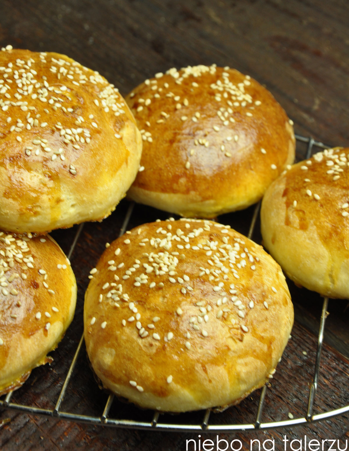 Wymieszałam masło, wodę, cukier, mleko w proszku i drożdże. Odstawiłam na kilka minut. Dodałam połowę mąki, sól, jajko, zagniotłam razem w misce. Dosypałam resztę mąki, dalej zagniatając przez kilka minut na podsypanym blacie. Wyszło elastyczne, sprężyste ciasto. Przykryte ściereczką odstawiłam do wyrośnięcia (w piekarniku ustawionym na 25 st, ale wystarczy inne, ciepłe miejsce ) na godzinę. Uformowałam z ciasta równy wałek i podzieliłam nożem na 9 części. Ulepiłam lekko spłaszczone kulki. Ułożyłam bułeczki na blasze wyłożonej papierem do pieczenia i ponownie odstawiłam do wyrośnięcia na 45 minut. Kilka minut przed końcem wyrastania rozgrzałam piekarnik do 200 st. Posmarowałam bułeczki żółtkiem wymieszanym z dwiema łyżkami mleka. Posypałam sezamem. Piekłam do zrumienienia, ok. 12- 15 minut bez termoobiegu.