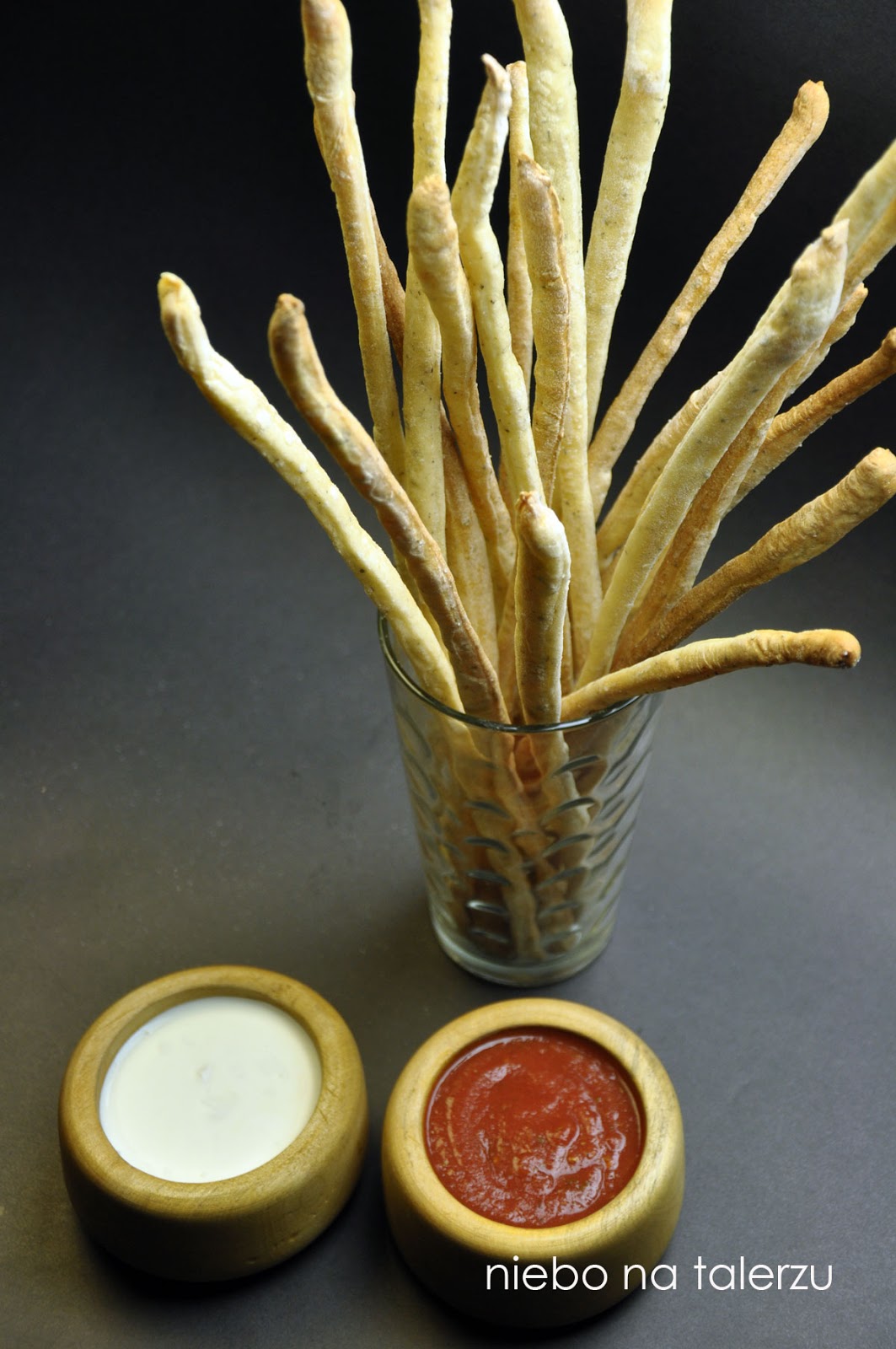 Gdyby było zbyt twarde, dodaj nieco więcej wody. Powinno ugniatać się podobnie jak plastelina. Pozostaw ciasto do wyrośnięcia w ciepłym miejscu na ok. pół godziny. Rozwałkuj je na 3-4 mm na podsypanym mąka blacie. Nożem lub kółkiem do krojenia pizzy tnij półcentymetrowe paski. Przełóż je na dwie blaszki wyłożone papierem do pieczenia. Piecz w piekarniku z termoobiegiem lub bez w temp. ok. 180 st, do zrumienienia ciasta.