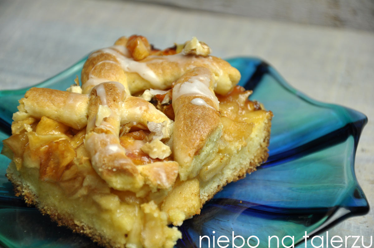 Połową ciasta wyłożyłam nasmarowaną masłem i posypaną tartą bułką blaszkę. Można je rozwałkować między dwoma arkuszami papieru do pieczenia lub zwyczajnie wykleić ręką. Rozgrzałam piekarnik do 180 st. Wyłożyłam jabłka. Z pozostałego ciasta uformowałam wałeczki i ułożyłam kratkę. Piekłam ok. 40 minut. Po wyjęciu polałam lukrem i posypałam orzechami.