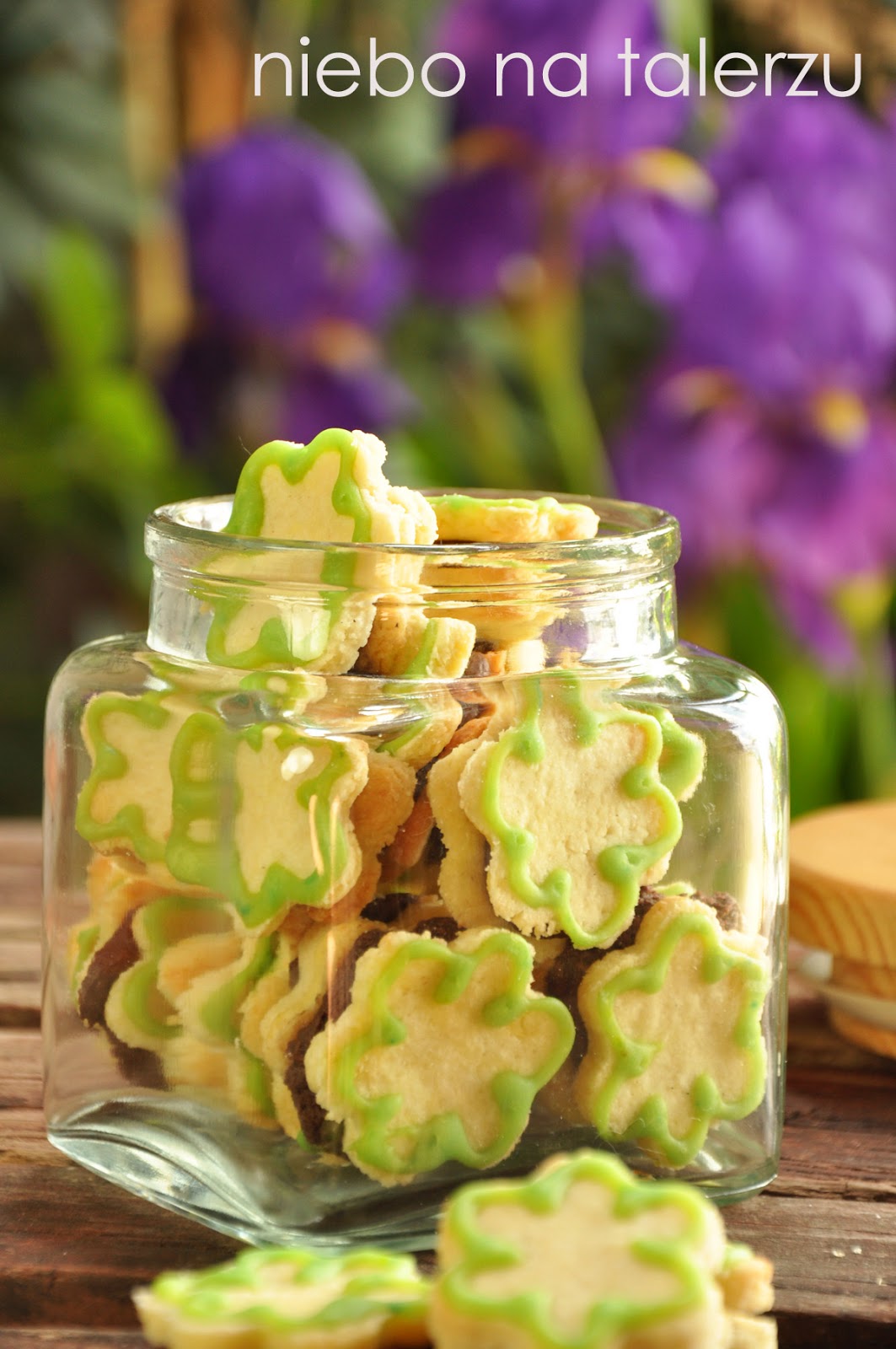 Masło pokroić na kawałki. Wszystkie składniki ciasta zagnieść szybko w misce, uformować kulę i wstawić do lodówki na 10-15 minut. Gdyby było zbyt gęste, dodać odrobinę wody. Odrywać po kulce wielkości dużej pomarańczy i wałkować na grubość ok. 2-3 mm (nie naciskając zbyt mocno)  na podsypanym mąka blacie lub stolnicy. Wycinać foremką małe kwiatki  albo kółka np. kieliszkiem. Układać na wyłożonych papierem do pieczenia blaszkach. Piekarnik rozgrzać do 170 st. Piec 5-8 minut do lekkiego zrumienienia ciastek.