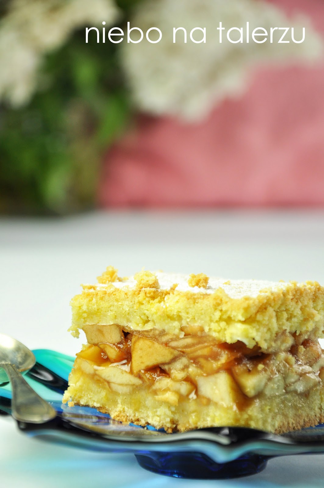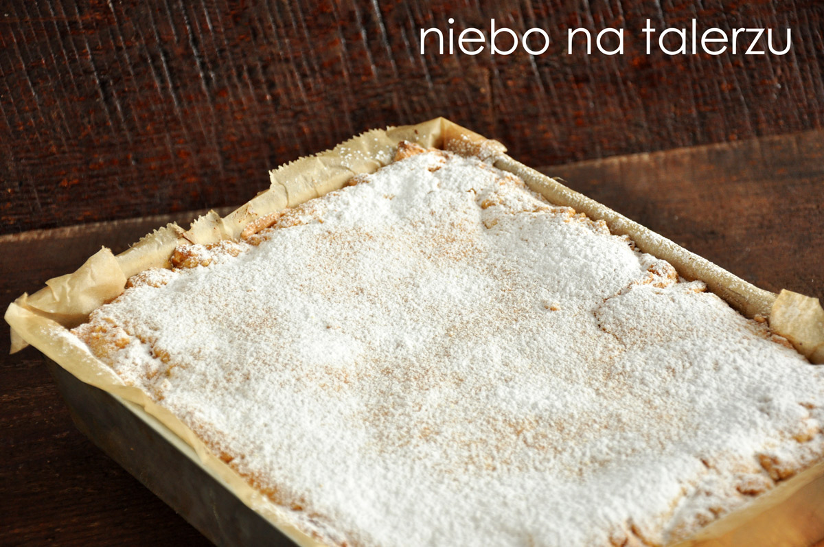 Zagnieść szybko ciasto. Podzielić na dwie części, zawinąć w folię aluminiową i włożyć na pół godziny – godzinę do lodówki. Piekarnik rozgrzać do 170 st. Blaszkę nasmarować masłem i wysypać tartą bułką, połową ciasta wykleić spód, wyłożyć na nie jabłka. Pozostałą część ciasta rozwałkować na podsypanym mąką blacie mniej więcej na wielkość blaszki i przykryć owoce. Piec około godziny pilnując, by wierzch zbytnio się nie zrumienił. Jeśli tak się dzieje, można nakryć ciasto  folią aluminiową. Po upieczeniu, przy pomocy sitka posypać ciasto.