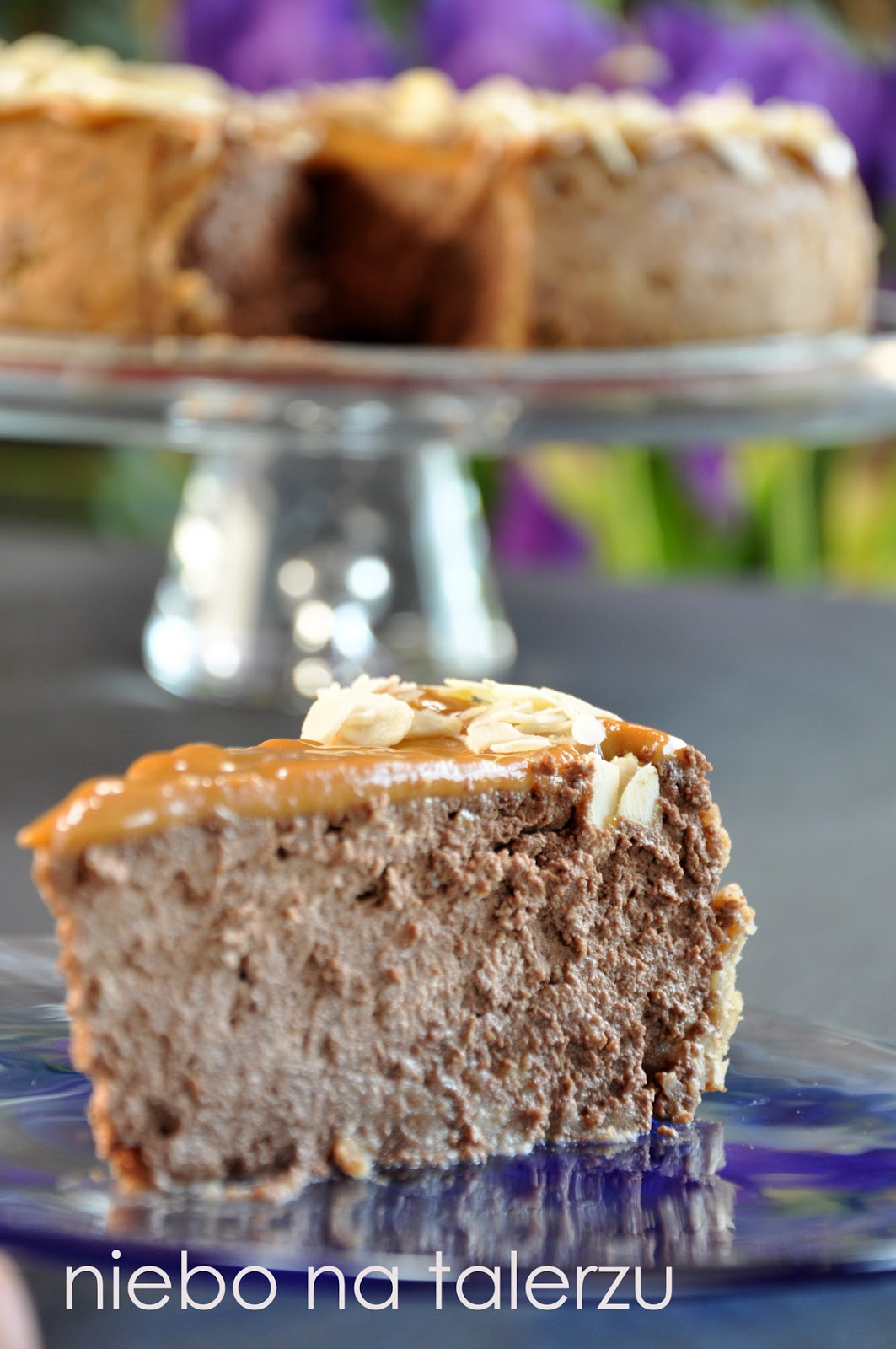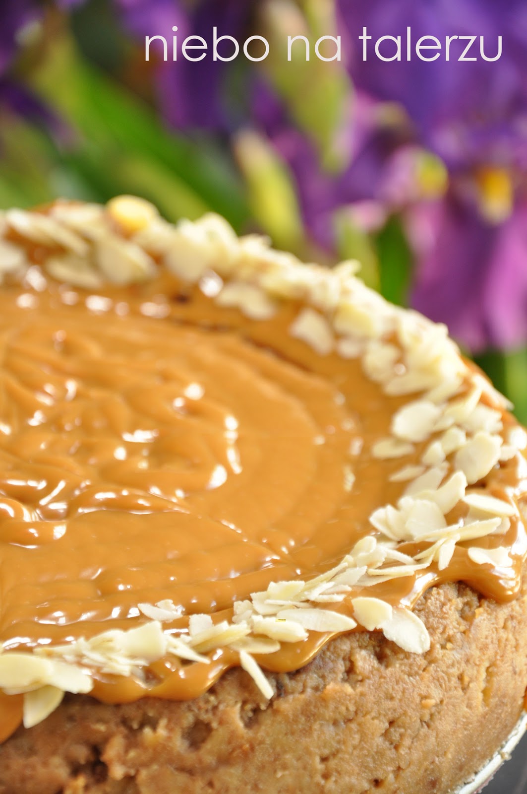 Ustawić blaszkę na kratce od piekarnika, wsuwając pod nią naczynie napełnione gorącą wodą. W ten sposób stworzymy sernikowi łaźnię parową. Przy mniejszej ilości ciasta można wstawić owiniętą szczelnie folią aluminiową tortownicę do większej blaszki z gorącą wodą. Duża nie zmieściła mi się do żadnej, stąd konieczność zastosowania “łaźni”. Piec godzinę, wystudzić w uchylonym piekarniku. Masę krówkową podgrzać lekko mieszając w rondelku, przełożyć do dekoratora lub torebki foliowej z uciętym rogiem i wylać na ciasto. Udekorować płatkami migdałów lub posiekanymi orzechami. Sernik włożyć do lodówki na kilka – kilkanaście godzin.