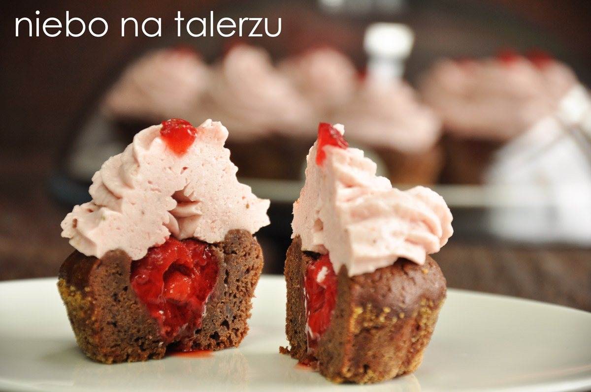 Bardzo trudno powiedzieć sobie – zjem jedną. Babeczki z truskawkami są znakomitym testem na silną wolę. Najlepiej zaprosić łasuchowych gości i niech wyjedzą je jak najszybciej. Miękkie, wilgotne i zupełnie jak brownie, choć nieco wyrośnięte. Bardzo czekoladowe. I do tego ten kontrastowy, lekko kwaśnawy dodatek truskawki i bita śmietana. W zależności od wielkości foremek ilość sztuk wyjdzie różna. U mnie wyszłoby pewnie 14. Mam 12 niezbyt wysokich babeczkowych dołków, zostało więc trochę ciasta, które wylałam do małego naczynia żaroodpornego. Jeśli ktoś ma formy na muffinki normalnej wielkości, przy 12 sztukach ilość czekoladowej masy powinna być odpowiednia. Jeśli odrobina ciasta zostanie, można uformować kilka okrągłych ciastek na papierze do pieczenia i włożyć do piekarnika razem z babeczkami.