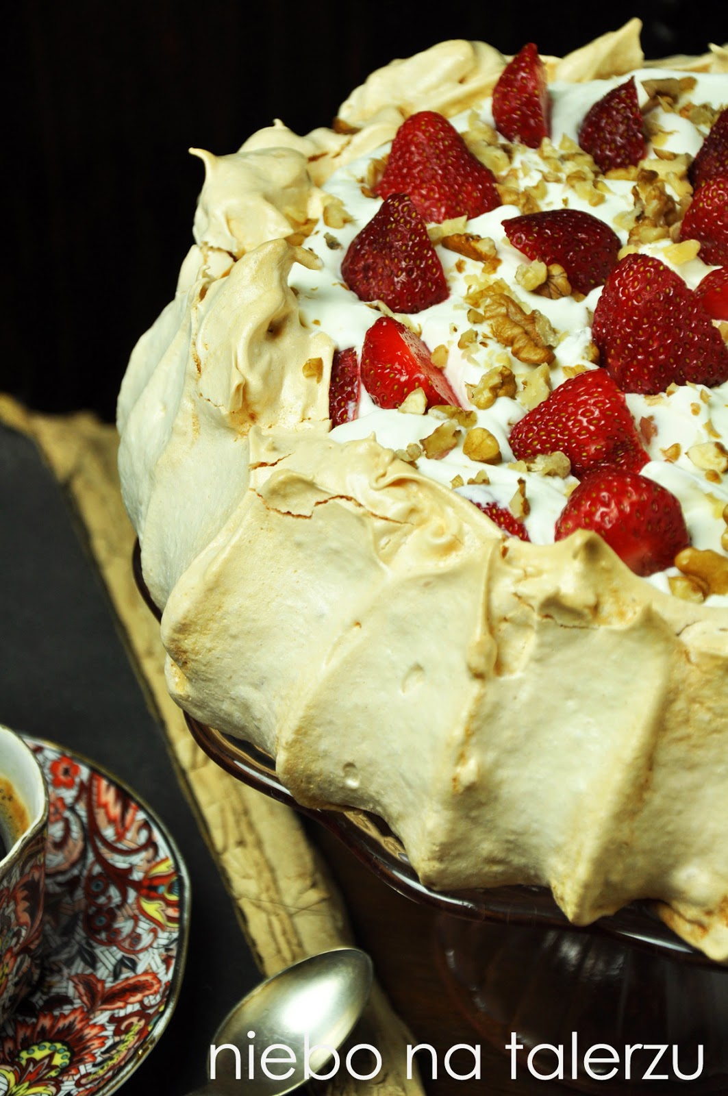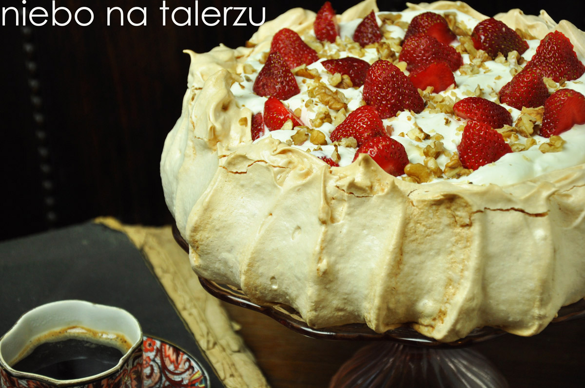 Pamiętam, że kiedy mój tata miał imieniny, mama szykowała blachy ciast, a on zawoził je do pracy i tam obchodził je hucznie. Kolejne uroczystości odbywały się w gronie rodzinnym i tak świętowanie trwało tydzień. Urodziny olkowe również odbyły się w trzech turach, szczęściara:) Nie wiem czy to jeszcze tort Pavlova, czy dasquoise (czyt.dakłas), czyli beza w towarzystwie bakalii. Bita śmietana i owoce jak w Pavlovej. Ale dodałam też orzechy. To może trochę dasquoise. Połączenie bardzo dobre i efektowne (podsłuchałam, że Olka mówiła, że ma tort jak z najlepszej restauracji), choć bardzo proste do przygotowania. Nie należy go raczej trzymać w lodówce bo traci chrupkość, najlepiej zjeść od razu, choć u nas poczeka do następnego dnia. Łatwy tort bezowy, tadaaam.
