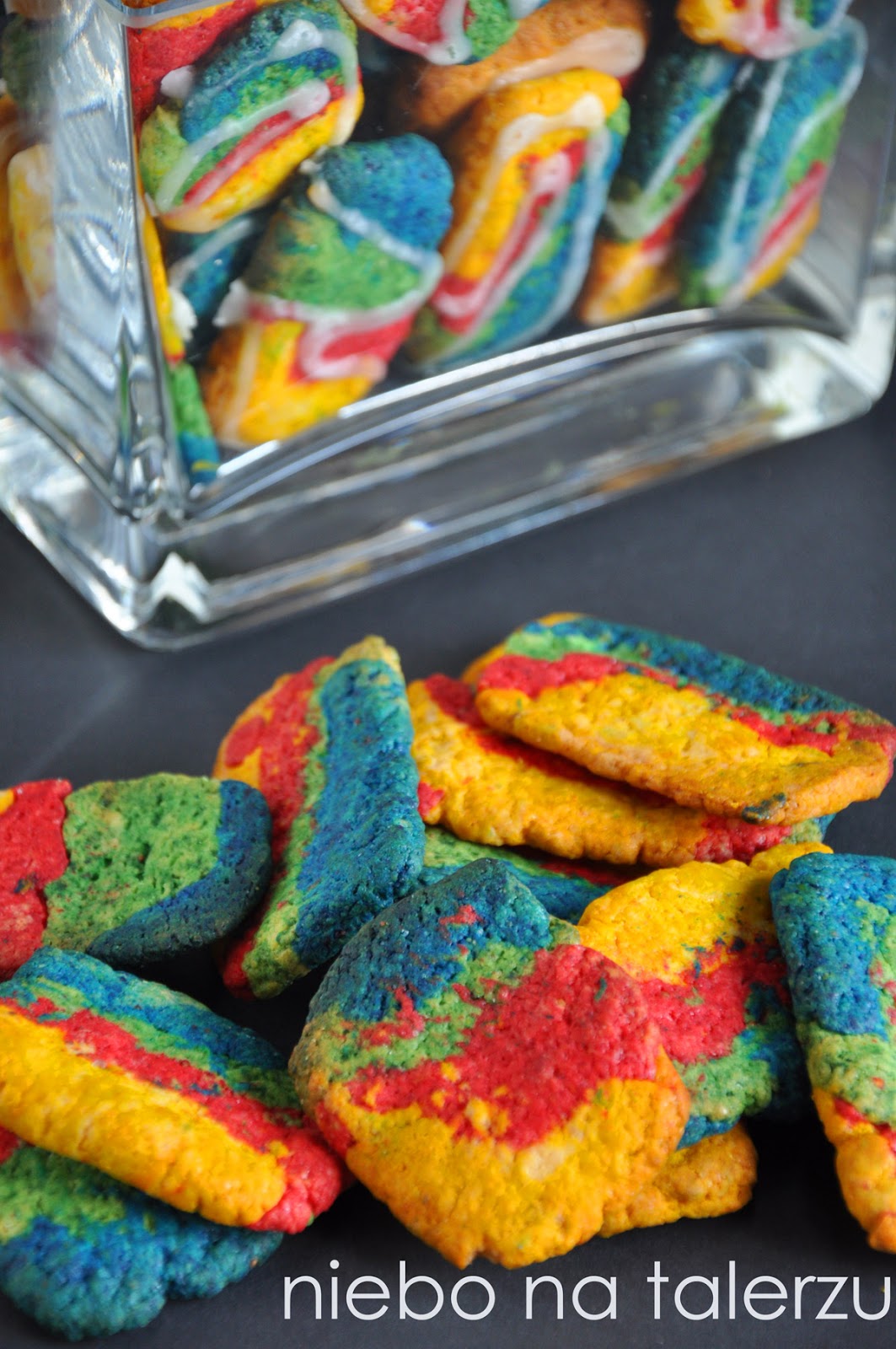 (niezbyt starannie) długi prostopadłościan. Skręcić lekko całość w spiralkę (wtedy kolory lekko zmieszają), ale można zostawić w takiej formie, ciastka będą w kolorowe paski. Nożem odkrawać plastry szerokości 4-5 mm, spłaszczyć w placuszek na blacie ( nie potrzebowały podsypywania mąką, ciasto jest dość tłuste), odkroić brzegi nożem tworząc równe prostokąty. Piekarnik rozgrzać do 170 st. Ciasteczka rozłożyć na dwóch blaszkach przykrytych papierem do pieczenia. Jeśli pieczemy obie blaszki jednocześnie, należy włączyć termoobieg. Piec ok. 10 – 15 minut. Ciasteczka powinny złapać nieco sztywność i leciutko się przyrumienić. Cukier puder wymieszać dobrze z łyżeczką soku z cytryny, powinien powstać gęsty lukier. Ozdobić ciastka kreskami wzdłuż linii kolorów.