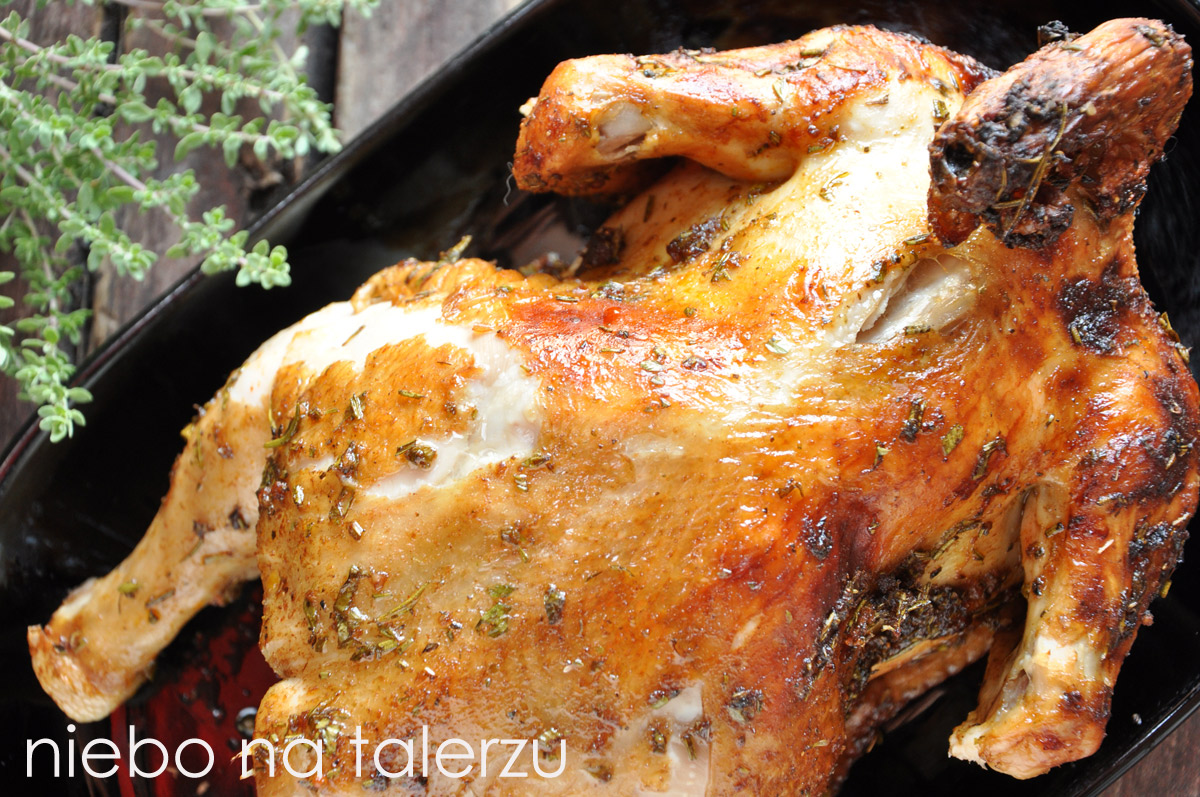 Kurczaka piekłam na rozmaite sposoby, ale zwykle w wieczór poprzedzający pieczenie lub rano tego samego dnia nacieram go różnościami, by w lodówce przeniknął smakami ziół. Chillibite niedawno zamieściła post- kurczak pieczony na puszce piwa. Popularnym sposobem jest tez użycie napełnionej nim lub innym płynem butelki, wszystko po to, by dość chude mięso kurczęcia nie straciło wilgotności. Najpewniejszym na to sposobem jest zamknięcie go w żaroodpornym naczyniu, garnku rzymskim lub rękawie foliowym. By uzyskać zrumienioną skórkę należy na 20 minut przed końcem pieczenia rozciąć rękaw lub zdjąć pokrywkę. Moi rodzice używali dużej ilości smalcu, polewając ptaka co 10 minut powstałym sosem. No pyszny był, ale ja podlewam mięso bulionem albo zwykłą wodą. Obok mięsa można poukładać warzywa, pieczarki albo pokroić w ćwiartki ziemniaki, posypać tymiankiem i solą i mamy niedzielne danie jak malowane. Chillibite wspomniała, że krojenie mięsa, dzielenie na części ma w sobie coś pierwotnego. Coś w tym jest. Z rodzinnego domu pamiętam dyskusje “skrzydełko czy nóżka”,  potajemne obdłubywanie skórki przez dzieci (jak niektórzy mogą jej nie lubić!). To był miły, niedzielny rytuał. Dla jego przypomnienia zamieszczam przepis.