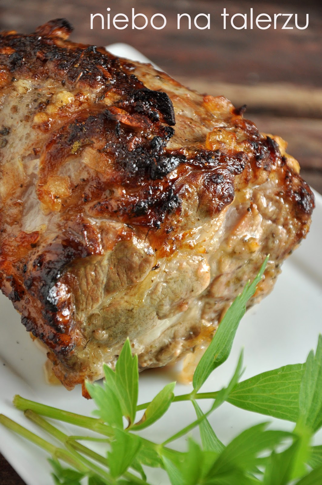 Składniki marynaty wymieszać i przełożyć do foliowego woreczka np. na mrożonki. Włożyć do niej mięso, ponacierać, by marynata oblepiła dokładnie całą jego powierzchnię, woreczek zawiązać tak, by przylegał do mięsa. Włożyć do lodówki na dwie – trzy godziny a najlepiej na całą noc. Jeśli ktoś posiada garnek rzymski do pieczenia, należy go namoczyć przez 20 minut w wodzie i wstawić z mięsem do zimnego piekarnika. Można też użyć żaroodpornego naczynia lub woreczka do pieczenia. Piec ok. godzinę i piętnaście minut ( na 200 st.), piętnaście minut przed końcem zdejmując pokrywkę lub rozcinając woreczek, by mięso się zrumieniło. Jeśli pieczemy większy kawałek, trzeba przeznaczyć na każdy kilogram godzinę i dla pewności jeszcze 15 minut. Przy kawałku 1,5 kg trzeba zatem piec mięso godzinę i czterdzieści pięć minut. Wyjąć z piekarnika i pozostawić na 20 minut bez krojenia. Zbyt wczesne rozkrojenie spowoduje wypłynięcie soków i mięso straci soczystość.