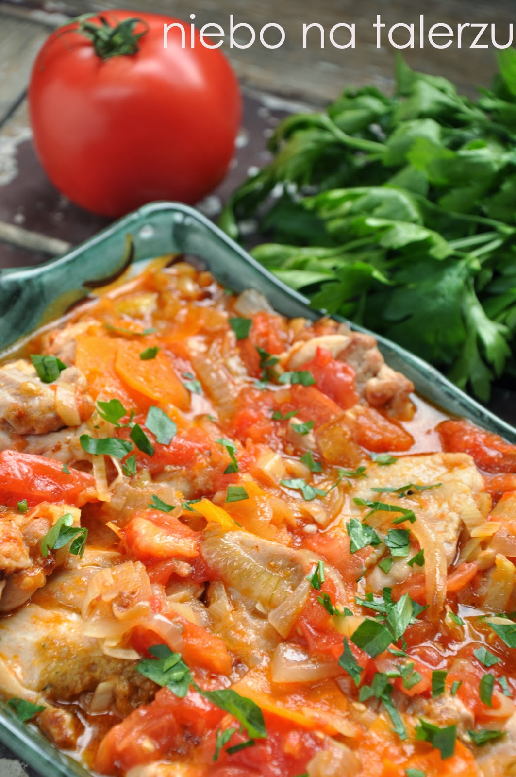 Mięso ostrym nożem pozbawić kości. Przeciąć wzdłuż na pół, by powstały dwa cienkie plastry. Nie szkodzi, że nie są równe, albo nieregularnych kształtów, tak ma być. Osolić, posypać przyprawami. Na patelni rozgrzać tłuszcz. Wykładać na patelnię kurczaka (skórką do dołu), obsmażyć na złoto z każdej strony. Mięso przełożyć na talerz i na tą samą patelnię wrzucić pokrojone warzywa ( marchewka w cienkie plastry, por i cebula w cienkie półkrążki). Kiedy złapią lekko złotawy kolor, dodać mięso i dusić chwilę pod przykryciem by cebula była miękka i dodać pomidory bez skóry, pokrojone w cząstki. dusić jeszcze chwilę by nieco się rozpadły. Jeśli ktoś lubi więcej sosu, może dodać nieco wody. Dosolić do smaku, posypać posiekaną natką pietruszki.