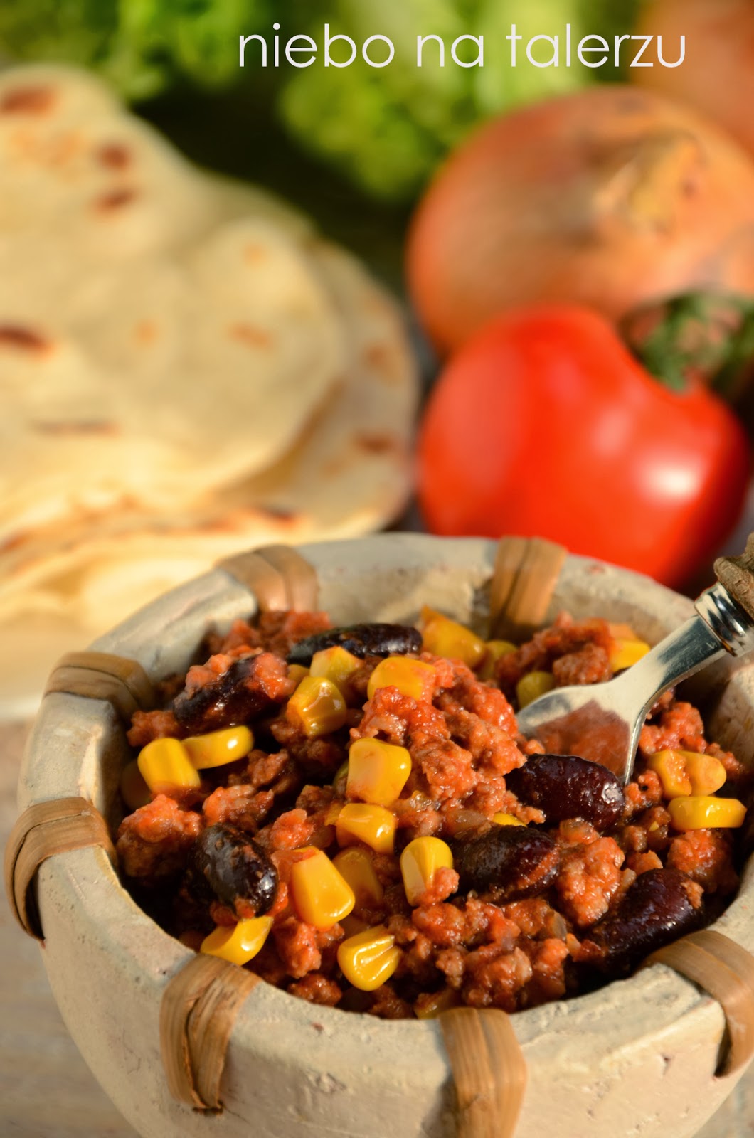 Na dużej patelni lub w rondlu rozgrzać olej i zeszklić pokrojoną w kostkę cebulę, dorzucić pokrojony drobno czosnek, chilli, kmin rzymski i mieszać przez pół minuty. Dodać mięso i smażyć dalej mieszając, aż straci kolor surowizny. Dodać pokrojone drobno pomidory bez skórki i resztę przypraw. Przykryć pokrywką i dusić mieszając od czasu do czasu ,przez ok. 15 min. Paprykę pokroić w kostkę, dodać do mięsa, dusić kolejne 5- 10 minut. Na koniec dorzucić przepłukaną na sicie fasolę i kukurydzę, całość podlać połową szklanki wody lub bulionu, zagotować i podawać.
