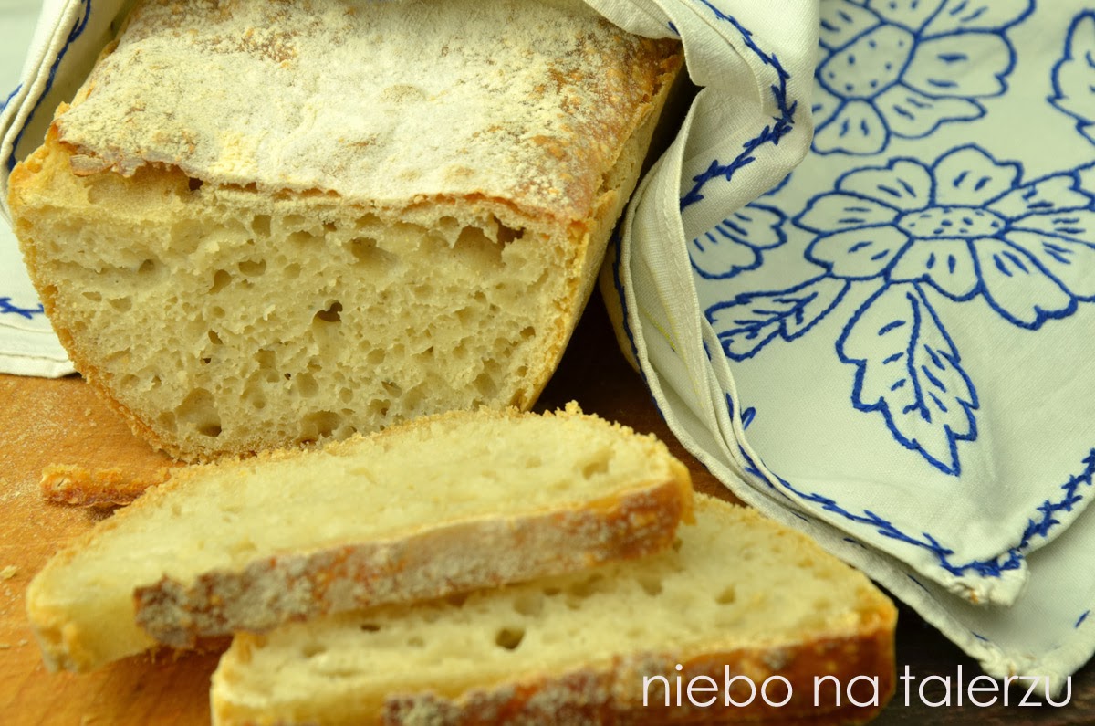 Keksówkę (o pojemności ok. 1kg, ok. 25 cm) posmarować olejem lub oliwą, oprószyć mąką. Wylać do niej ciasto. Odstawić do wyrośnięcia na 45 – 60 minut. Piekarnik rozgrzać do 210 st, piec chleb ok. 40 minut. Wyjąć z piekarnika, podważyć lekko nożem, chleb powinien wyjść z formy. Gdyby był wilgotny od spodu, wsadzić do piekarnika, już bez formy na 5- 7 minut.