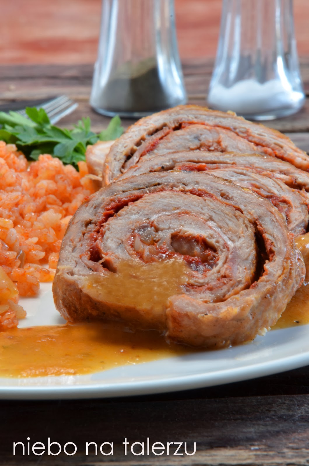 Są soczyste i delikatne. Użyłam do ich przygotowania wieprzowiny. Takiej, którą da się pokroić w duże plastry i rozbić tłuczkiem na cienkie płaty. Nada się szynka czy łopatka. Wieprzowina ma bardziej soczyste mięso niż kurczak, a do miękkości dusi się krócej niż wołowina. Zawijać można grzyby, szpinak, ogórki kiszone, paprykę, pomidory suszone, ser fetę i inne, co się ma w lodówce. Użyłam pasty pomidorowej, cienkich plasterków wędzonego boczku i cebuli. Nic szczególnego, a mięso zawinięte w roladki od razu nabrało walorów świątecznych:) To był bardzo dobry obiad.