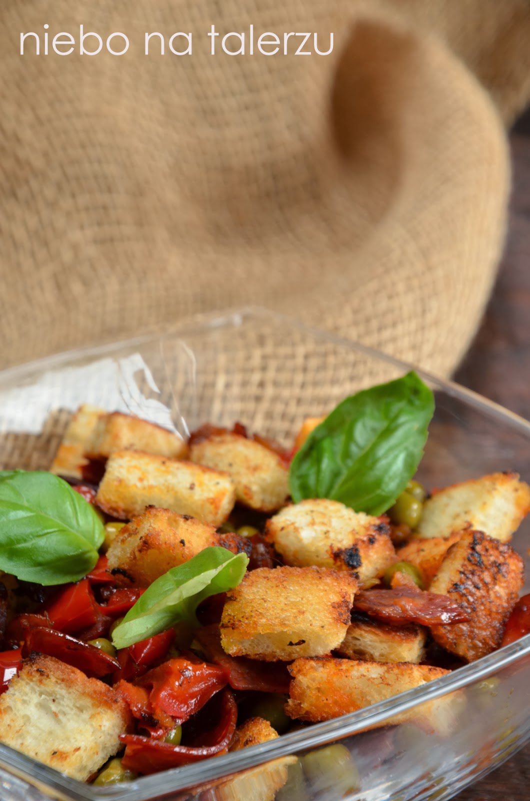 Chorizo pokroić w paseczki. Bułki w kostkę, ok. 1 cm. Cebulę i paprykę w niezbyt drobną kostkę. Na rozgrzaną patelnię wrzucić chorizo i podsmażać do chrupkości. Przełożyć łyżką na talerz. Na tłuszczu wytopionym z kiełbasy podsmażyć mieszając cebulę z papryką. Gdyby tłuszczu było mało, podlać nieco oliwą. Kiedy warzywa lekko zmiękną, dodać groszek, smażyć chwilę ( mrożony nieco dłużej, z puszki króciutko) wyjąć je na talerz, a na tę samą patelnię wrzucić rozgnieciony czosnek, wlać ocet balsamiczny i wrzucić pokrojone kawałki bułki. Mieszając smażyć na niewielkim ogniu, by lekko się zrumieniły. Porwaną na kawałki sałatę ułożyć na dnie salaterki,wyłożyć na nią kiełbasę wymieszaną z usmażoną papryką i cebulą, posypać wszystko gorącymi grzankami z bułki.