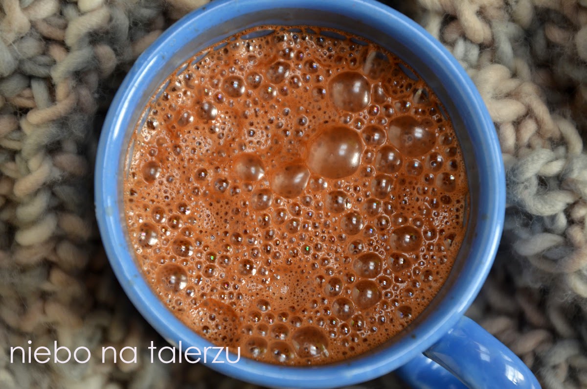 Niektórzy uważają, że tylko ta na śmietance to prawdziwy raj dla podniebienia, a reszta nie może nazywać się czekoladą. Należy próbować różnych wersji, by odnaleźć najlepszy dla siebie wariant. Ta na śmietance jest dla mnie zbyt gęsta i ciężka. Nie dałam rady wypić kilku łyków. Mleko o zawartości tłuszczu 3,2% jest idealne. Dla puszystości, spieniłam je małym “bzyczkiem”, można go kupić za kilka złotych w niefirmowych sklepach, bardzo przydatna rzecz. Oczywiście spienianie nie jest konieczne, ale daje miły dla podniebienia efekt. Do gorącej czekolady dodaję szczyptę chilli (bo jeszcze bardziej podkręca czekoladowość i przemianę materii, mocniej rozgrzewa), łyżeczkę cukru waniliowego, pomarańczowego ekstraktu czy cynamonu. Ambrozja.