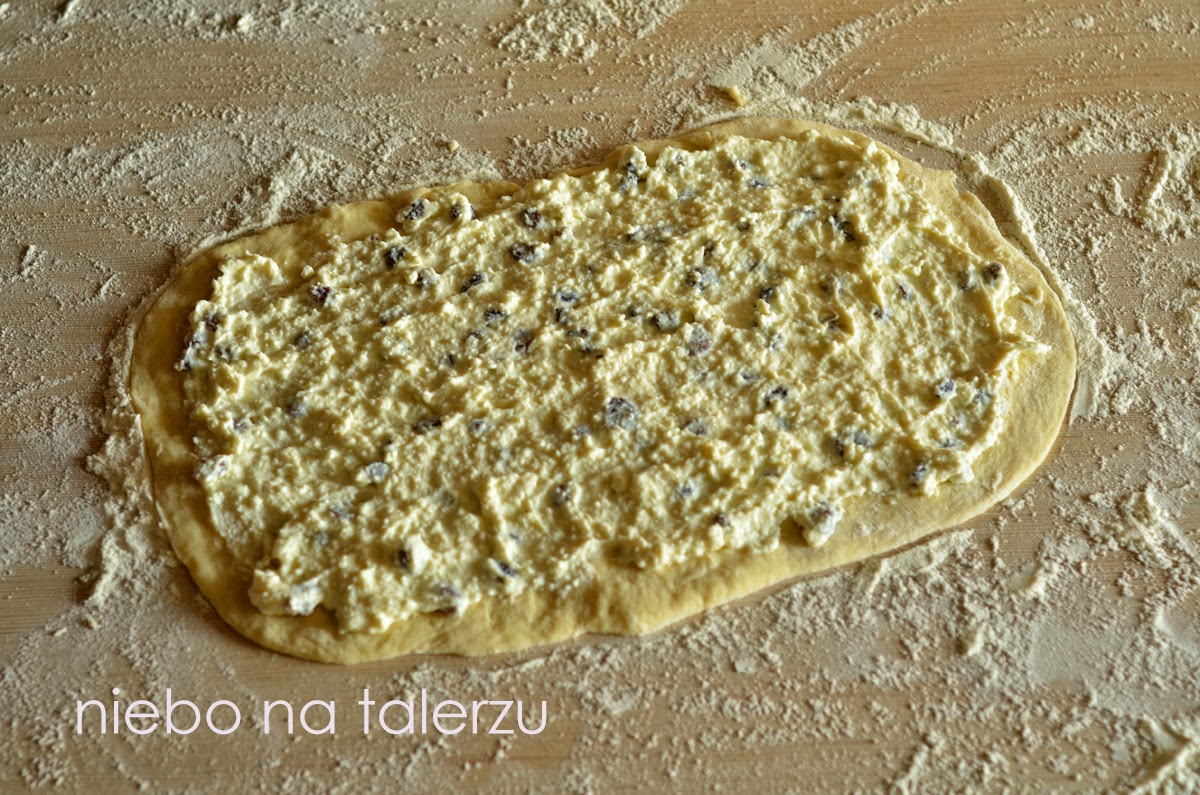 Jeśli używamy świeżych drożdży, dodać je do letniego mleka z łyżeczką cukru i mąki, czekać ok. 15 minut, by urosły i dodać stopniowo do mąki. Suche wsypać od razu do miski z mąką, dodawać mieszając, stopniowo mleko, jajko, żółtka, cukier, wanilię i skórkę z cytryny. Zagnieść ręką na blacie lub stolnicy (podsypując mąką lub przy pomocy haków miksera w misce) na elastyczne ciasto. Kiedy będzie wyrobione ( po ok. 10 -15 minutach), dodajemy masło i wyrabiamy jeszcze chwilę do wchłonięcia tłuszczu. Odstawić do wyrośnięcia w ciepłe miejsce (ok. 26- 28 st) na ok. godzinę, półtorej. Podzielić ciasto na pół, spłaszczyć umączoną ręką na dobrze podsypanym mąką blacie, na prostokąty grubości ok. 0,5 cm. Każdą część posmarować połową porcji sera zmieszanego z jajkiem, cukrem i rodzynkami.