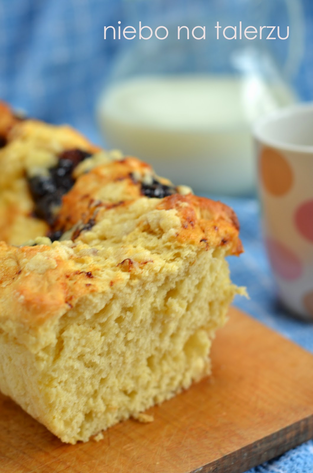Pamiętam obrazek: mój tata siedzi przy oknie, odrywa czerstwe już kawałki drożdżowca i macza je w zbożowej, mlecznej kawie. Kawie z dużego, półlitrowego, wysokiego kubka z napisem PSS- społem. Ktoś pamięta takie?:) Nie mam kubka, ale jak należy upiec drożdżowe – wiem, tu jest specjalny wpis o cieście drożdżowym – klik. Miały być pączki z piekarnika ale mnie podkusiło… i ubiłam całe jajka z cukrem. Taki eksperyment. Ciasto za nic w świecie nie chciało się zagnieść. Lepiło się wyłącznie do rąk moich. Wymieszałam zatem tylko porządnie i długo, wstawiłam na noc do lodówki, bo drożdżowe może sobie rosnąć i w taki sposób. Przelałam mazistość do długiej formy, włożyłam ją do zimnego piekarnika. I…. wyszło puszyste i mięciutkie, mega wilgotne ciasto drożdżowe. Przy stygnięciu lekko zapadło się środkiem, ale kto by na to zwracał uwagę. Kto powtórzy, niech napisze czy wyszło. Ja powtórzę na pewno.