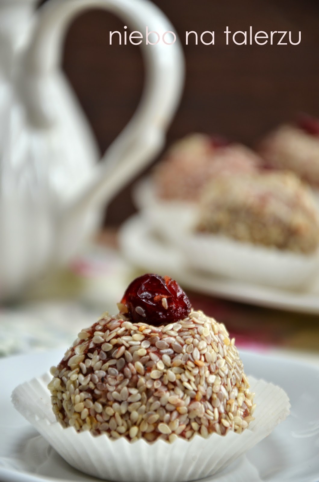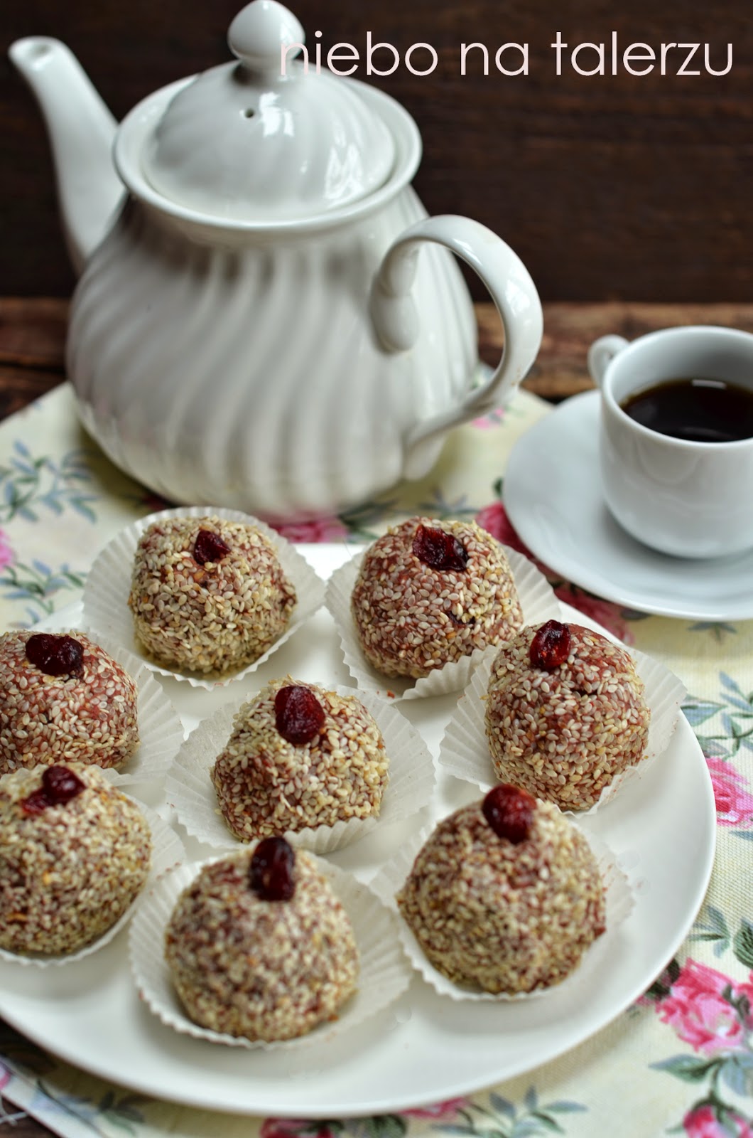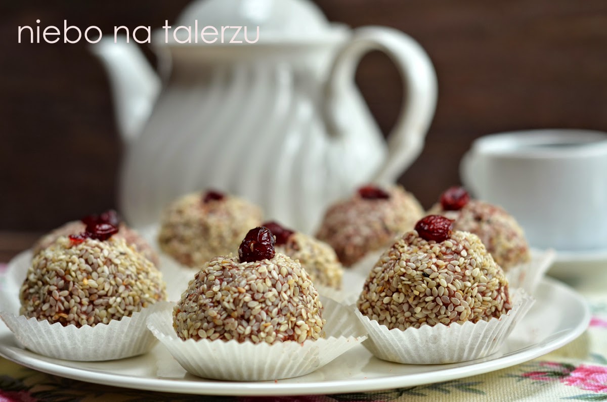 Ciastka bez pieczenia, bo pod postem z innymi bajaderkami SabinaAnna napisała – “uratowałaś mój zakalec! ” Zakalcom poświęciłam osobną stronę na blogu, bo czasem zdarza się najlepszym (link tutaj) i nie ma się co martwić. W końcu to tylko zakalec! Na zakalce i resztki ciast najlepsze są właśnie bajaderki. Nada się wyschnięty sernik, murzynek, piernik, niezbyt świeże pączki, rozmaite ciastka i trochę dżemu lub powideł. Jeśli nie mamy sernika, sprawę załatwi biały ser albo jogurt czy śmietana. Małe kulki wychodzą za każdym razem o trochę innym smaku. Dodałam ulubionej żurawiny i tym razem obtoczyłam je w uprażonym na złoto, chrupiącym sezamie. Nie ma tu ścisłego, recepturowego  przepisu, ale zasada jest taka: masa zbyt rzadka – dodać tartej bułki, zbyt gęsta – odrobinę więcej mleka, śmietany czy jogurtu. No i jeszcze ugotowana, zblendowana kasza jaglana. Przemycone, niewyczuwalne, zdrowe dobro. I odrobina czerwonego barwnika, jeśli okazja jest walentynkowa i akurat mamy.
