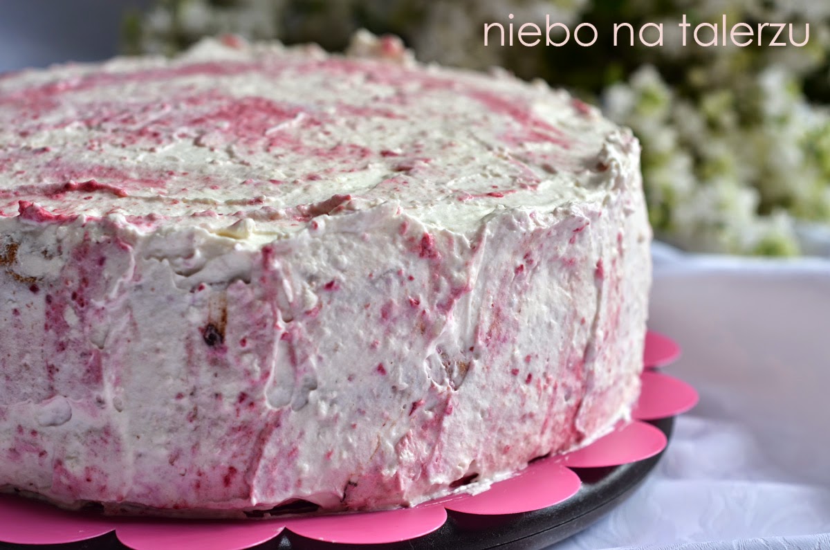 Tort z owocami, lekki, dobrze nasączony, który dzięki warstwie musu owocowego znacznie zyskuje na wyrazistości. Nada się na komunię i każde inne towarzyskie spotkanie. Sprawdziłam na osobistych gościach wielokrotnie – nikt nie narzekał:). Do przygotowania owocowego musu można wykorzystać mrożonki, a po przesmażeniu z cukrem- rabarbar. By uzyskać różowy kolor trzeba wybrać mocno różowe łodygi, bez zielonych części. W torcie na zdjęciu użyłam zamrożonych wiśni. Gdyby ktoś chciał zmienić kolor czy smak podstawy ciasta, może wykorzystać przepis na  biszkopt makowy, biszkopt orzechowy czy biszkopt czekoladowy. Ciasto można upiec poprzedniego dnia, czy nawet dwa dni przed składaniem tortu.