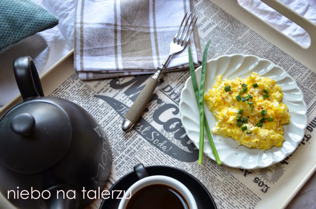 Jajecznica, bo kto by tam nie znał i nie robił jajecznicy. To rzecz znana w Polce już podobno od XVII wieku, a kto  wie, może i wcześniej. Cała sztuka polega na tym, by jajka miały delikatnie ścięte białko, ale zachowały puszystość i nie wysuszyły się na twarde kawałki. To dzieje się tak szybko:) Mój sposób na jajecznicę idealną polega na pełnej kontroli temperatury. Podgrzewam patelnię z niewielką ilością masła, wbijam jajka, zestawiam całość z ognia i mieszam poza palnikiem. Używam do mieszania drewnianej lub plastikowej łopatki, by nie uszkodzić powłoki naczynia, rzecz jasna. Ciepło rozgrzanej patelni najczęściej wystarcza, by dwa, trzy jajka ścięły się bez dalszego podgrzewania. Natychmiast po zauważeniu, że białko ścięte, przekładam masę na talerzyk. Jajecznica gotowa.