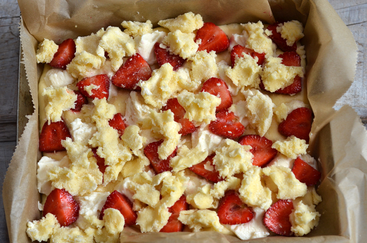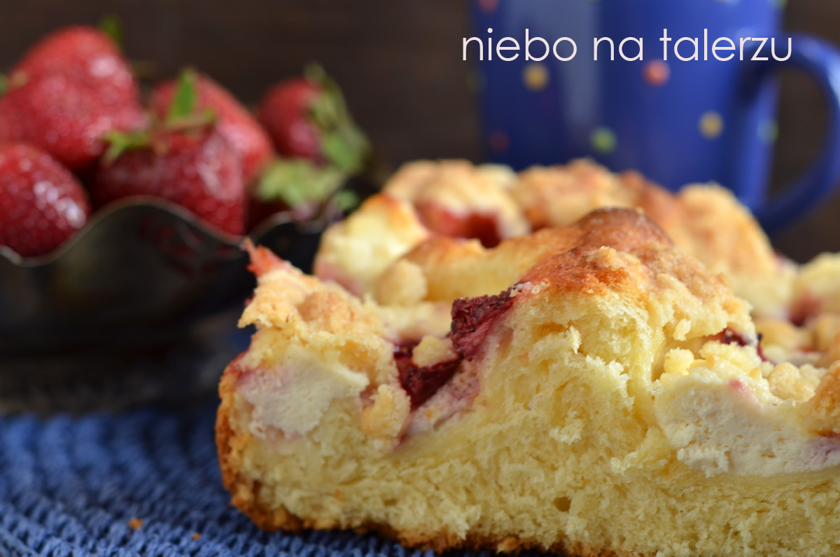 Drożdżowe ciasto z truskawkami i serem. Drożdżowe ciasto z kruszonką