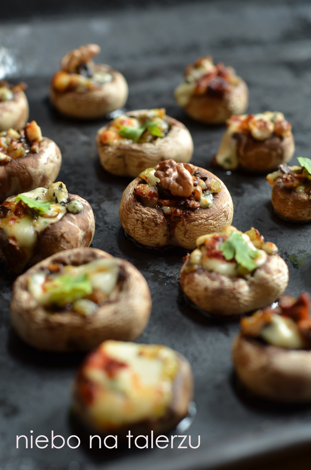 Pieczarki na przekąskę. Przepis na romantyczną kolację we dwoje. Z sałatą – na obiad. Pieczarki faszerowane banalne, ale bardzo dobre. Kto lubi – dodaje kieliszek ulubionego wina do popicia. Sery można  podmieniać i wykorzystywać te co w lodówce, a nawet kupić specjalnie. Najlepsze są mieszanki. W tym przepisie występuje rokpol, ser feta a nawet trochę mozzarelli. Te z niebieską pleśnią duuużo wnoszą, choć nie trzeba ich dawać w wielkiej ilości. Najprościej bywa najlepiej 🙂