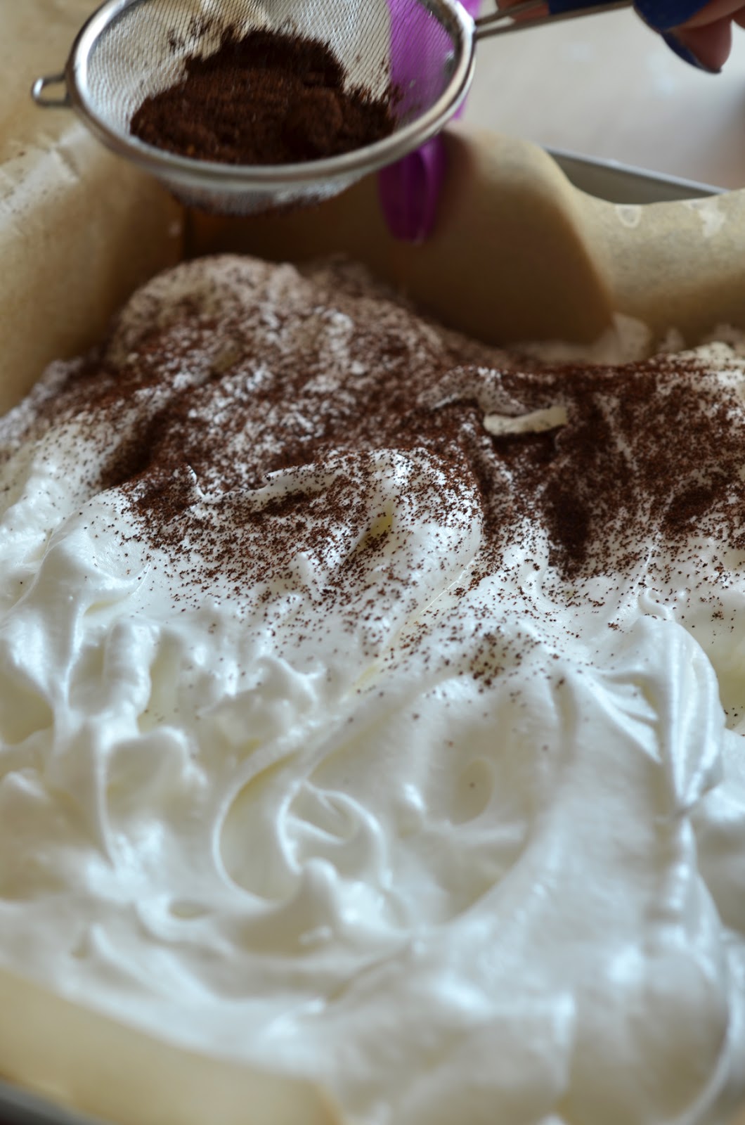 Białka starannie oddzielić od żółtek. Ubić na sztywno ze szczyptą soli. Kiedy będzie prawie gotowa dodać cukier i dalej ubijać aż stanie się lśniąca. Mąkę z proszkiem wsiać przez sitko do piany, wymieszać na najwolniejszych obrotach miksera lub łyżką, by piana nie opadła. Dodać ocet, wymieszać.Wyłożyć niezbyt równo na dnie formy. Pianę posypać przez sitko zmieloną kawą.