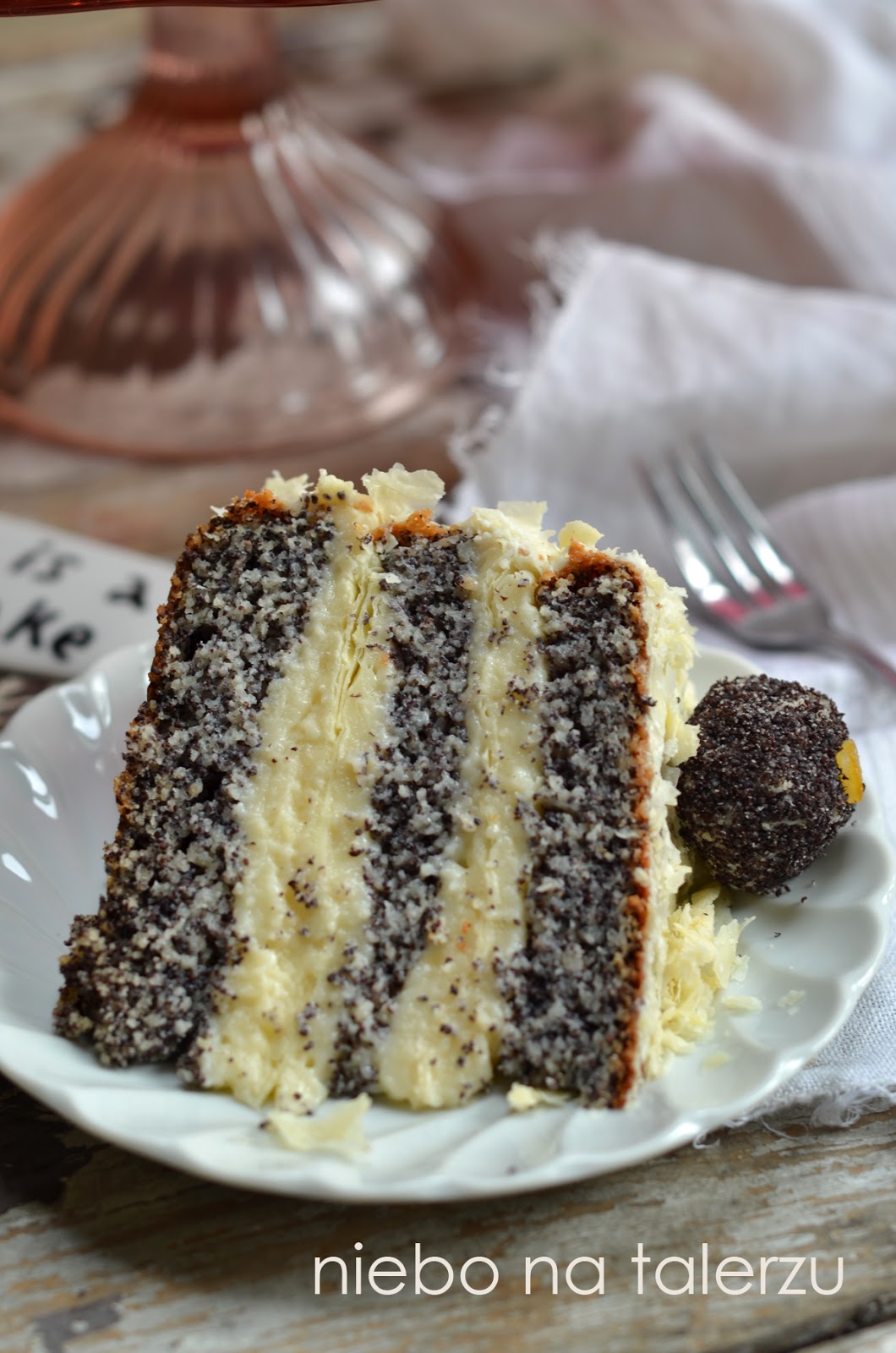 Napoleoński tort makowy – bardzo podobne ale nieidentyczne ciasto podpatrzyłam w wileńskiej cukierni. Nazwę przetłumaczono jako “mommys poppy seed napoleon cake” czyli mamina makowa napoleonka. Ładnie, prawda? Torty z francuskiego ciasta, łączone z budyniowymi kremami to często spotykany tam smakołyk. Najczęściej występują w komplecie z dekoracją z trójkątnych, listkowanych, chrupiących kawałków, wyglądają cudnie. Trzeba dnia lub dwóch, by smaki przeniknęły się, część chrupiącego ciasta zwilgotniała od kremu. Cierpliwość zostanie nagrodzona. Można próbować już po trzech czterech godzinach, a niech tam. Ale te wytrzymałe dłużej kawałki są najlepsze…:) Biszkopt makowy można upiec nawet dwa dni wcześniej. Do składania tortów używam plastikowych podkładek (na zdjęciu różowa), to bardzo przydatna rzecz, umożliwiają bezpieczne przenoszenie ciasta z patery do pojemnika w lodówce.
