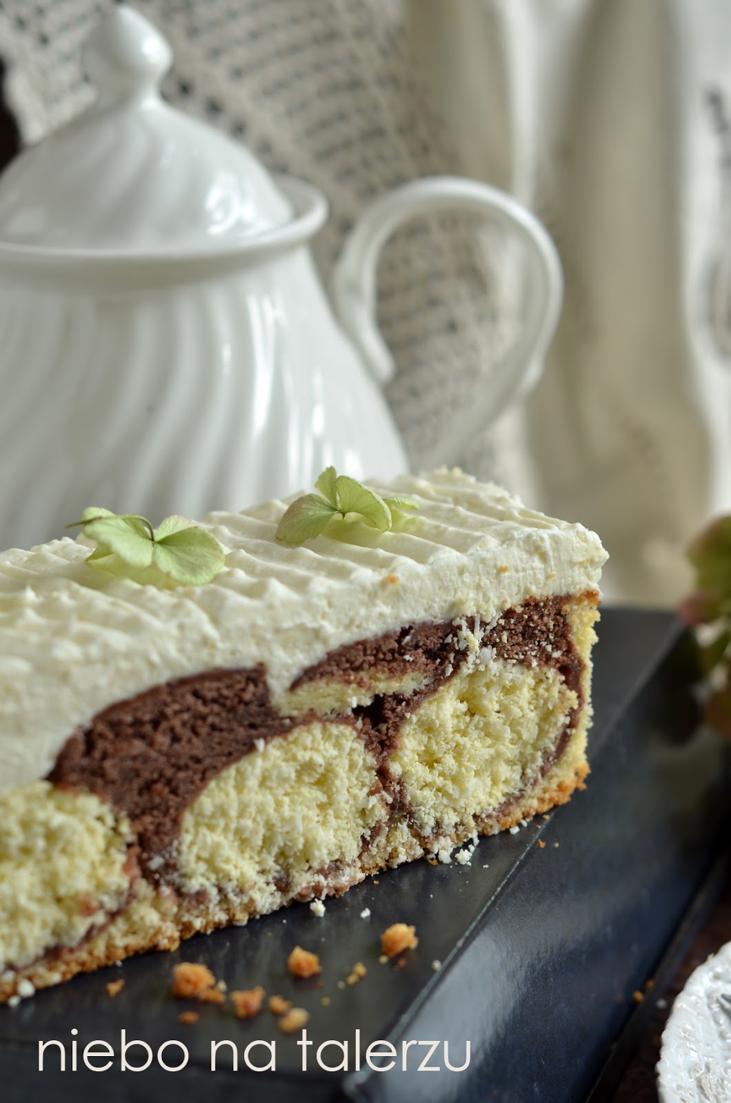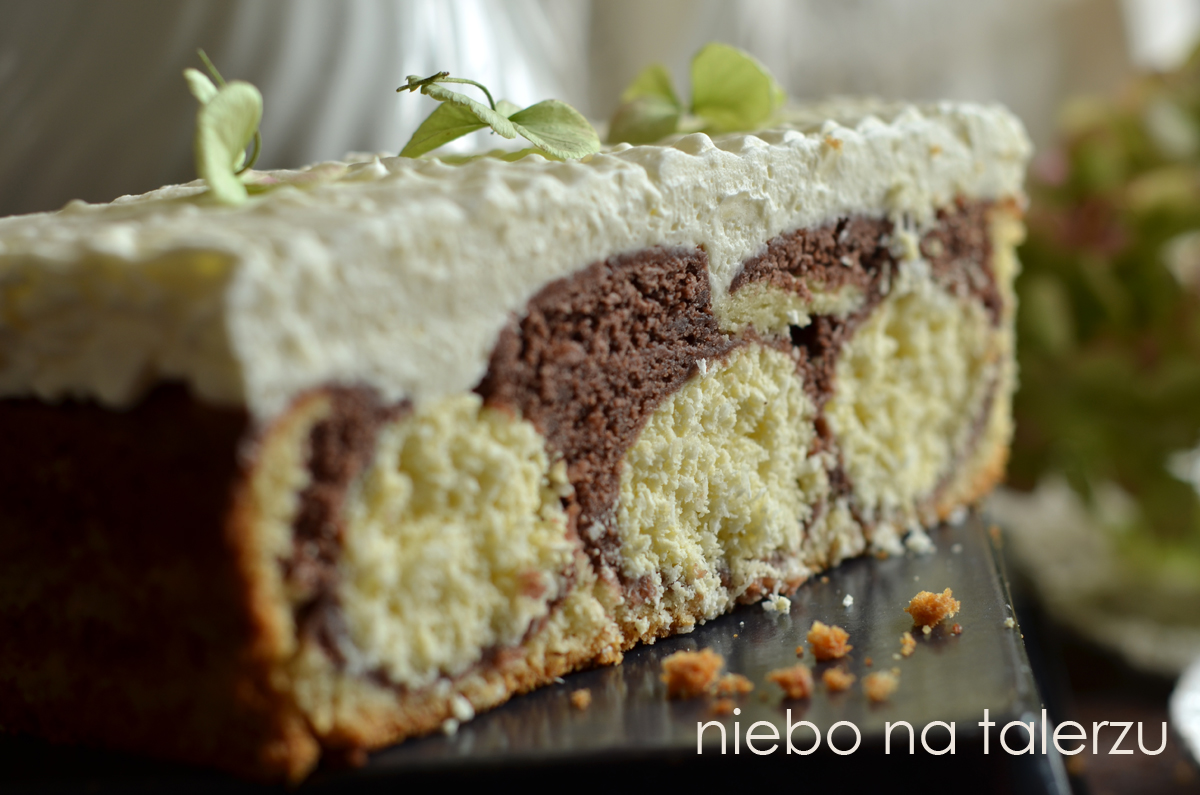 Masło utrzeć z cukrem na jednolitą masę. Osobno wymieszać mąkę z proszkiem do pieczenia. Ucierając, do maślanej masy dodawać po jednym jajku, następnie śmietanę i porcjami – mąkę z proszkiem. Połowę masy przełożyć do innego naczynia i wymieszać z kakao i mlekiem. Jasną masę wylać na spód blaszki, rozsmarować, wylać warstwę ciemną – rozsmarować delikatnie. Ułożyć kule lekko wciskając je w ciasto. Piec w całkowicie nagrzanym piekarniku ok. 45-50 minut. W połowie pieczenia przykryć lekko ciasto folią aluminiową, by wierzchnia warstwa nie wysychała.Śmietanę ubić, kiedy zesztywnieje dodać cukier a następnie ser mascarpone. Wyłożyć na wierzch ciasta.