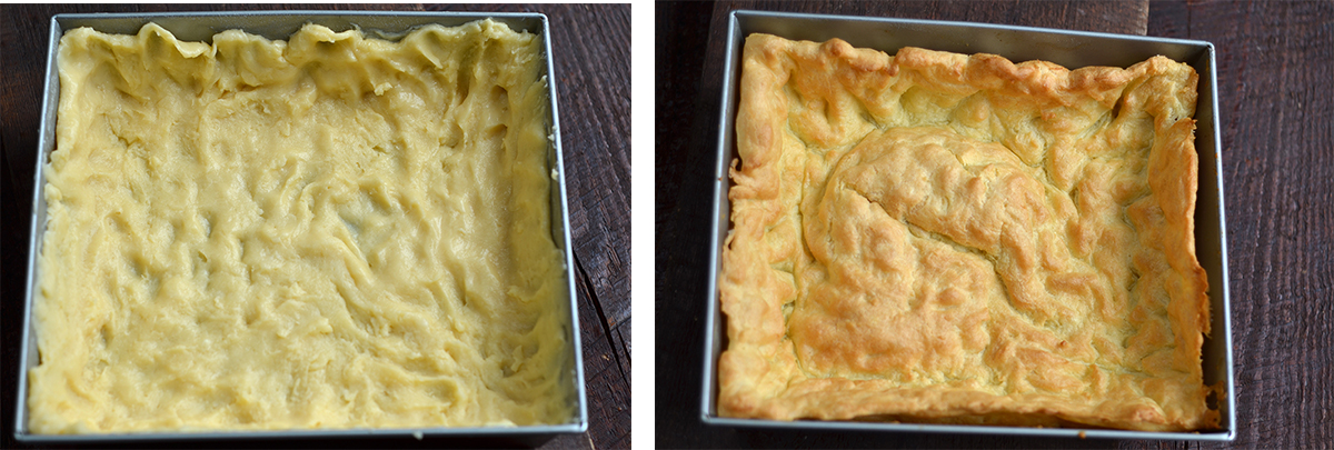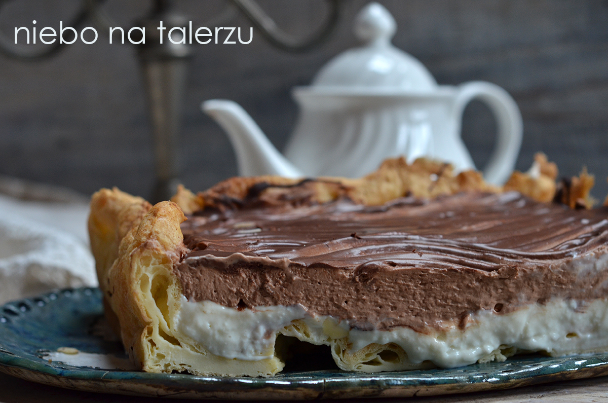 Bardzo pyszne ciasto z kremem, zwłaszcza dla fanów eklerek i ptysiów. Mistrzowskie. Tak mówi Tomek a on się zna. Potrafi zjeść 15 sztuk na raz. A gdyby ktoś jednak za ciastem ptysiowym/eklerowym nie przepadał, niech da jakiekolwiek. Nada się cienkie kruche, biszkopt lub sklepowe, prostokątne herbatniki. Tutaj, ptysiowa skorupka znana również z popularnej karpatki, tworzy foremkę dla podtrzymania kremu. A kremu są dwa rodzaje. Jeden sernikowy, drugi – czekoladowy mus na bitej śmietanie. Cały widz w tym, by ciasto wyłożyć w foremce niezbyt równo. Powstrzymać się przed gładzeniem i mizianiem. Im więcej nierówności, tym ciasto podczas pieczenia ładniej napełnia się powietrzem. Można je upiec w metalowej formie lub w prostokątnym naczyniu żaroodpornym.