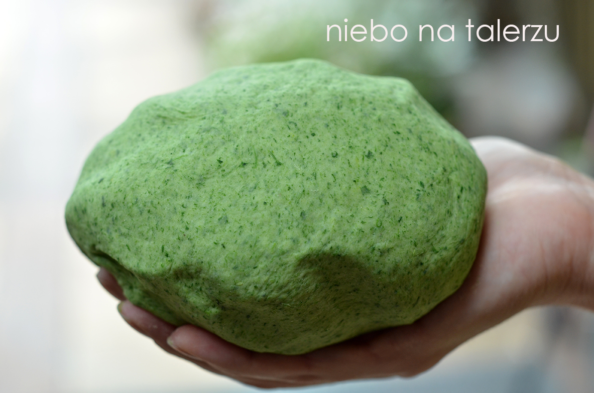 Tu zwyczajniej, ale przyznać trzeba, że zielone pierogi z “ruskim” nadzieniem wyglądają bardzo apetycznie:) Ciasto z dodatkiem kefiru lub całkowicie na kefirze jest elastyczne, jędrne, takie lubię najbardziej. Jak się człowiek uprze, to w 40 minut uda się ukleić, cztery porcje, sprawdziłam. Można też celebrować powoli i dostojnie, a nawet zaprosić do pomocy rodzinę. I ćwiczyć cierpliwość:)