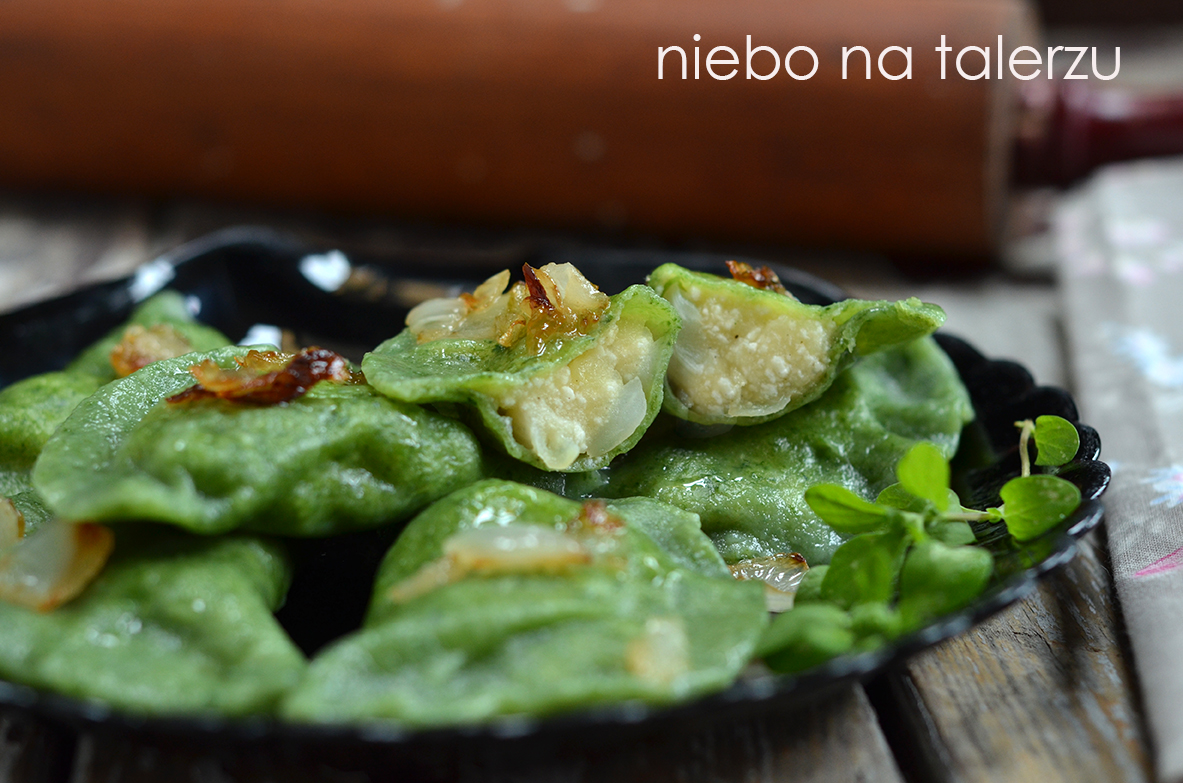 Zieloniuśkie, bardzo dobre, ruskie pierogi, które w cieście mają dodatek szpinaku. Stąd, rzecz jasna ten soczysty kolor.