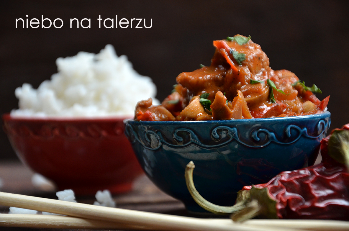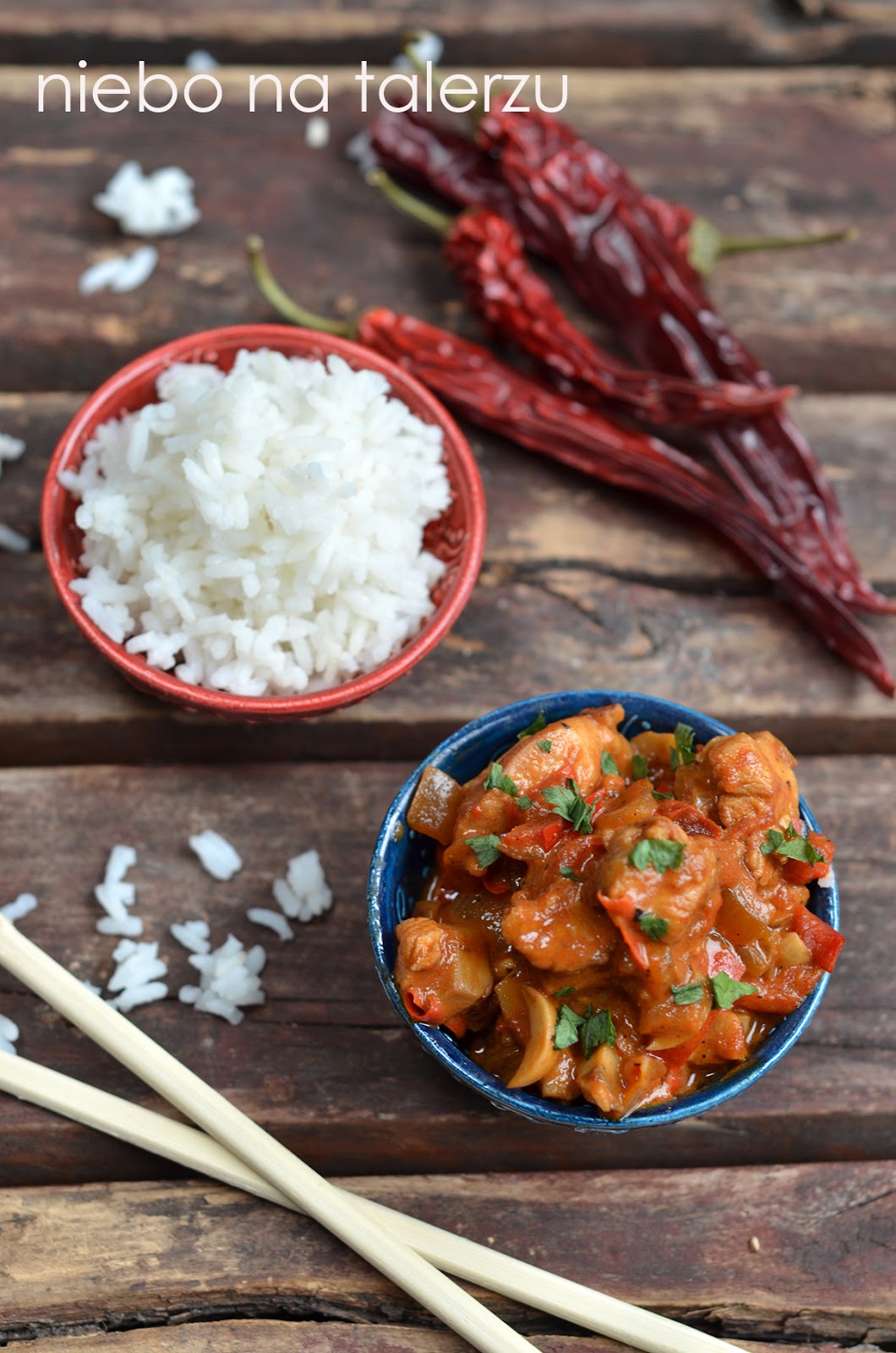Kurczak po indyjsku , jedna z potraw kuchni indyjskiej która jak wiadomo przyprawami stoi. W restauracjach koncentruję się głównie na ilości papryczek w menu, bo hindusi mają zupełnie inną niż ja wrażliwość kubków smakowych. Już jedna papryczka w spisie potraw powoduje, że na wszelki wypadek pytam o mleko czy jogurt, które zapobiegną ewentualnym mocnym wrażeniom. W domowej kuchni daję ostrości tyle na ile danego dnia mam ochotę, zazwyczaj nie przekraczam jednopapryczkowego oznaczenia. Kto chce, daje więcej pieprzu cayenne i sprawę ostrości ma załatwioną.