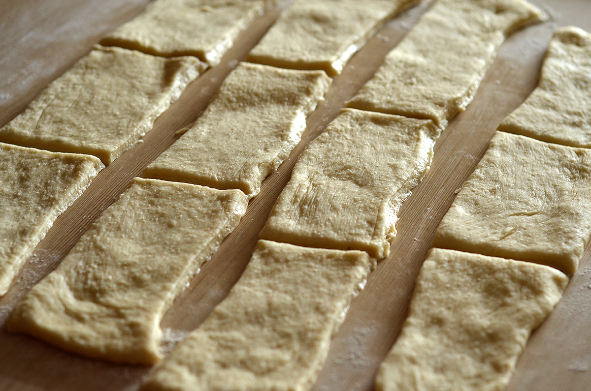 Wyjąć ciasto na podsypany mąką blat, rozwałkować na grubość ok. 0,4 cm i pokroić na 4 paski a każdy pasek na trzy części.