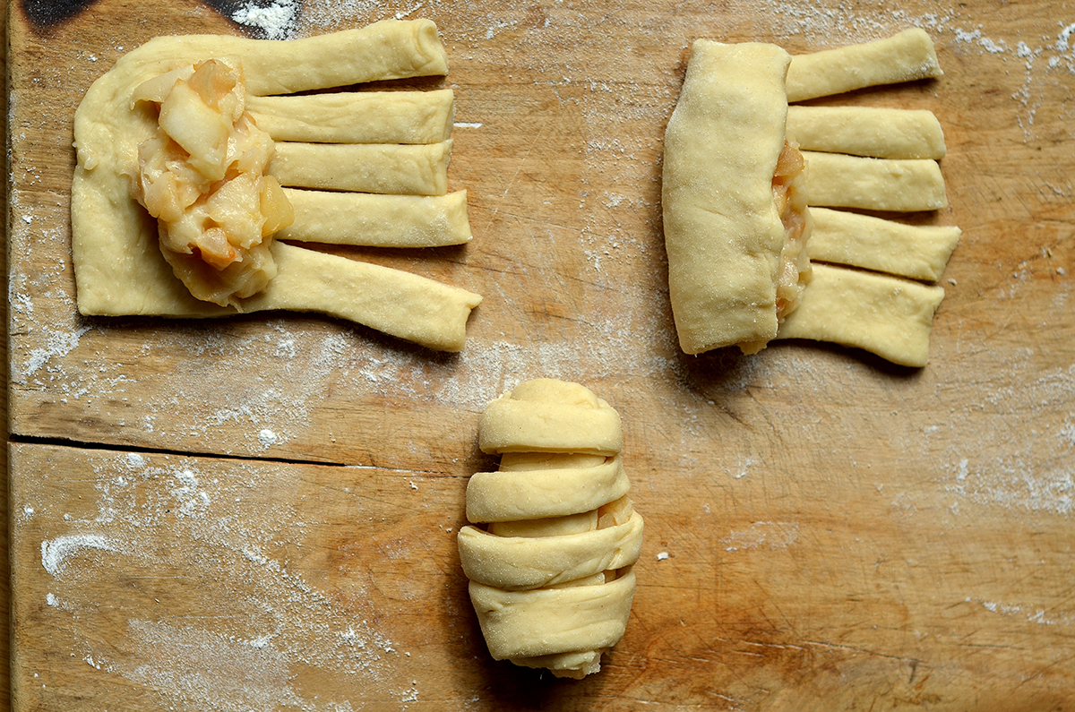 Na każdym prostokącie, mniej więcej 2-3 cm od węższej strony ułożyć łyżkę masy z jabłek. Dłuższą część ciasta pokroić na 4 lub 6 pasków. Nadzienie przykryć niepokrojoną częścią ciasta a następnie ułożyć na niej paski starając się je o ile to możliwe, zawinąć pod bułeczkę.