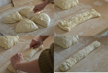 Wyjąć ciasto na podsypany mąką blat, podzielić na cztery części. Każdą po kolei rozciągnąć na długi prostokąt. Złożyć dłuższe brzegi do środka, rozciągnąć bułkę, formując ją jednocześnie tocząc w możliwie równą, długą bagietkę.