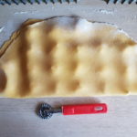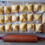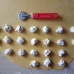 Na rozwałkowanym placku ciasta zaznaczyć nożem lub radełkiem, delikatnie linię przez środek. Na jednej z połówek ciasta układać łyżeczką porcje farszu z ricotty tak by między nimi był odstęp ok. 1,5 cm z każdej strony. Przykryć delikatnie farsz pustą połową ciasta. Leciutko docisnąć miejsca między porcjami . Nożem lub specjalnym radełkiem do faworków wycinać kwadratowe ciastka – pierożki. Odkładać na podsypane mąką deski do krojenia lub kuchenny blat. Czynności powtórzyć z drugą porcją ciasta.