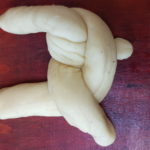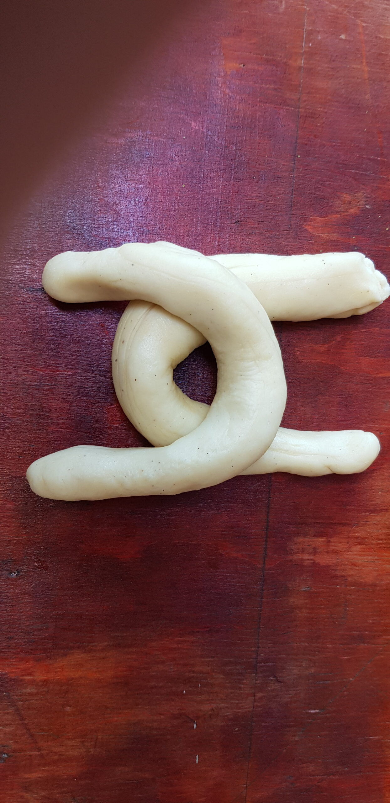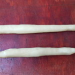 Z dwóch kawałków ciasta utoczyć wałeczki. Mogą być lekko grubsze przy końcach ale dobrze je również rolować chwilę by były gładkie. Końce będą tworzyć główki i ogonki.