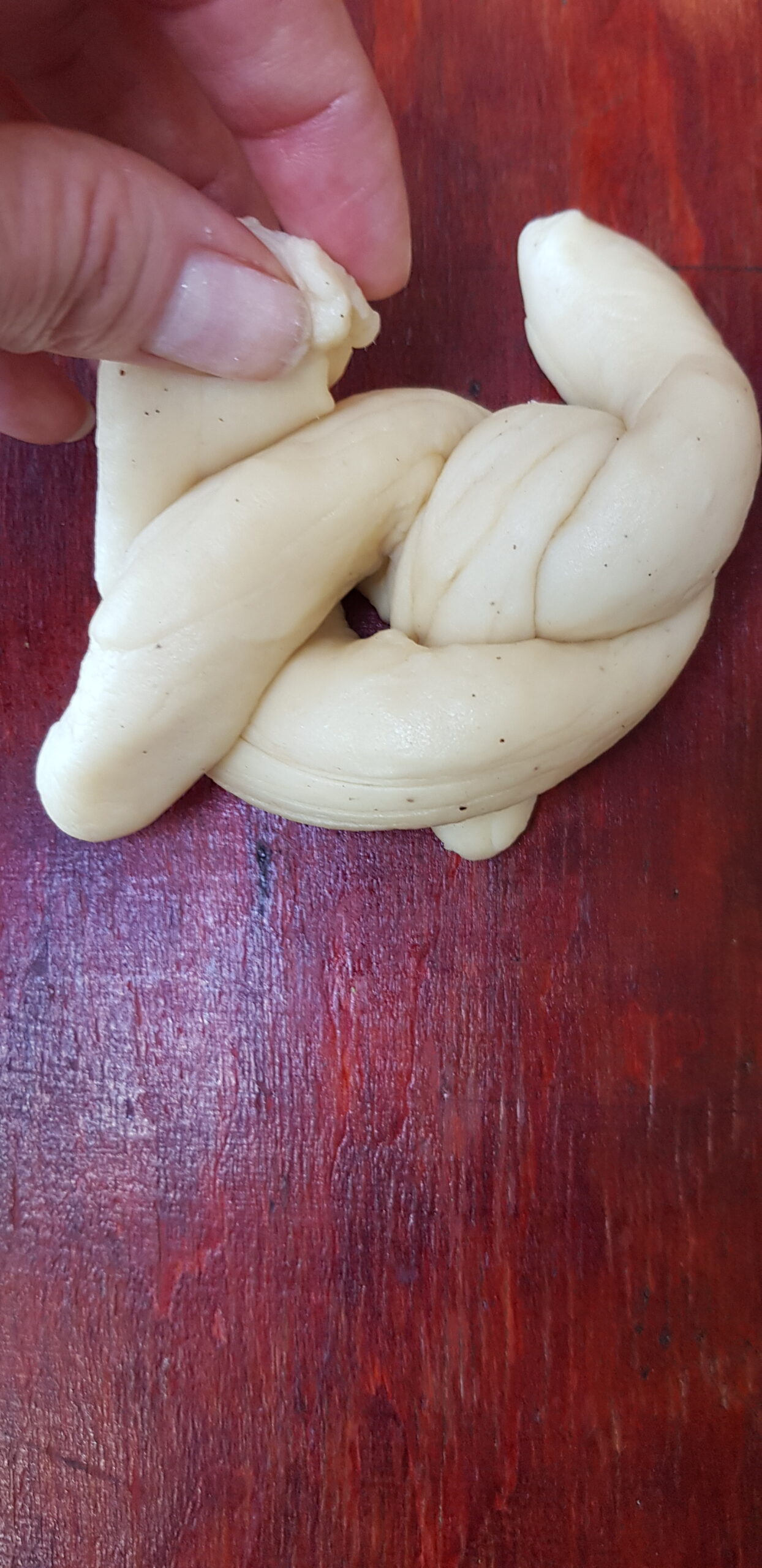 Przez powstały pomiędzy nimi otwór przewlec pod spód dwie końcówki wałeczków.