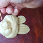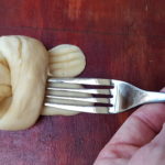 Przy pomocy widelca spłaszczyć dwie pozostałe części wałeczka – to będą ogonki.