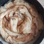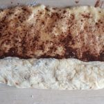 Następnie w zależności od tego co wybraliśmy na tworzenie marmurkowego wzoru – posypać cynamonem, polać stopioną w garnku nad parą czekoladą (by była rzadsza można dodać przy rozpuszczaniu 2-3 łyżki mleka) albo wyłożyć punktowo dżem. Umączoną dłonią zwinąć ciasto w rulon wzdłuż szerszego boku.