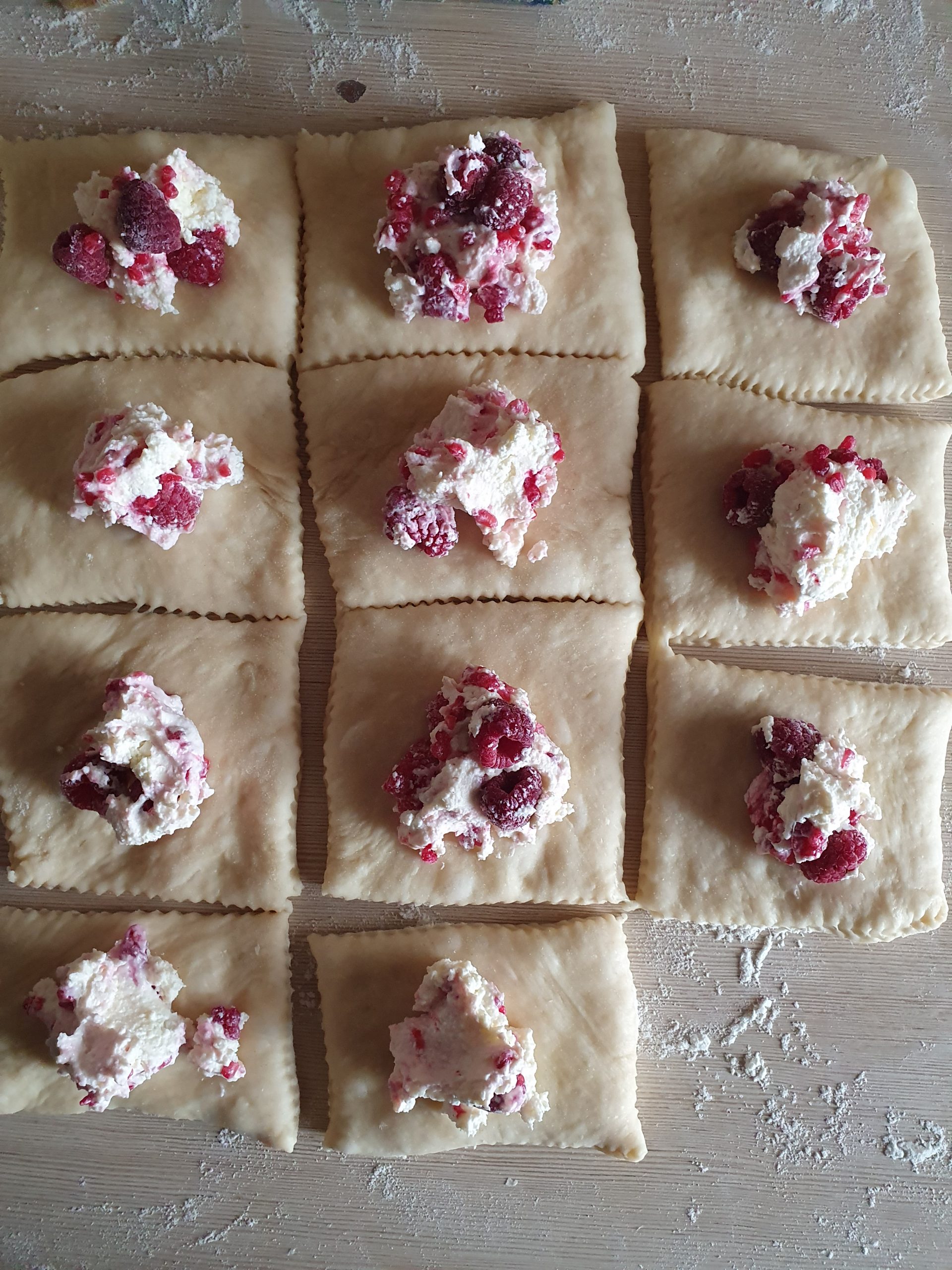 Puszyste drożdżówki z serem i malinami – mięciutkie, delikatne jak puch, z pysznym nadzieniem ze śmietankowego twarożku, sera mascarpone i malin. O tej porze roku – mrożonych, jednak nie zmienia to wcale a wcale ich wspaniałego smaku.