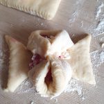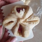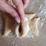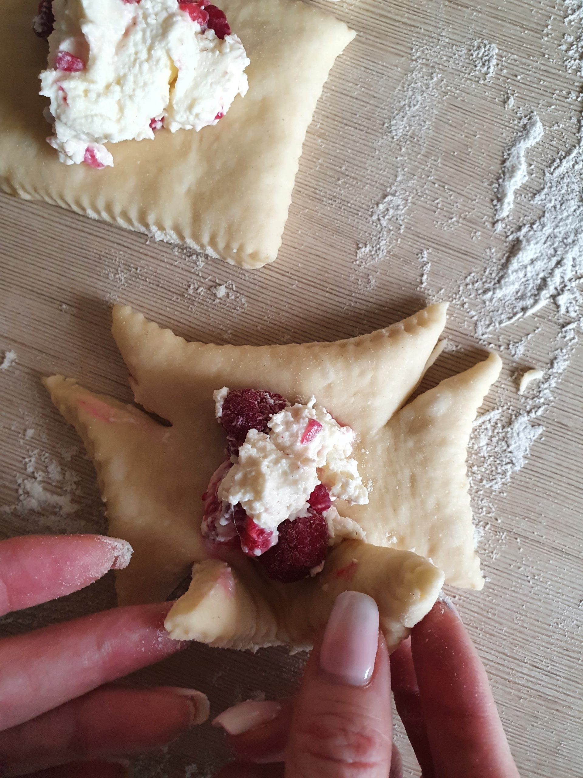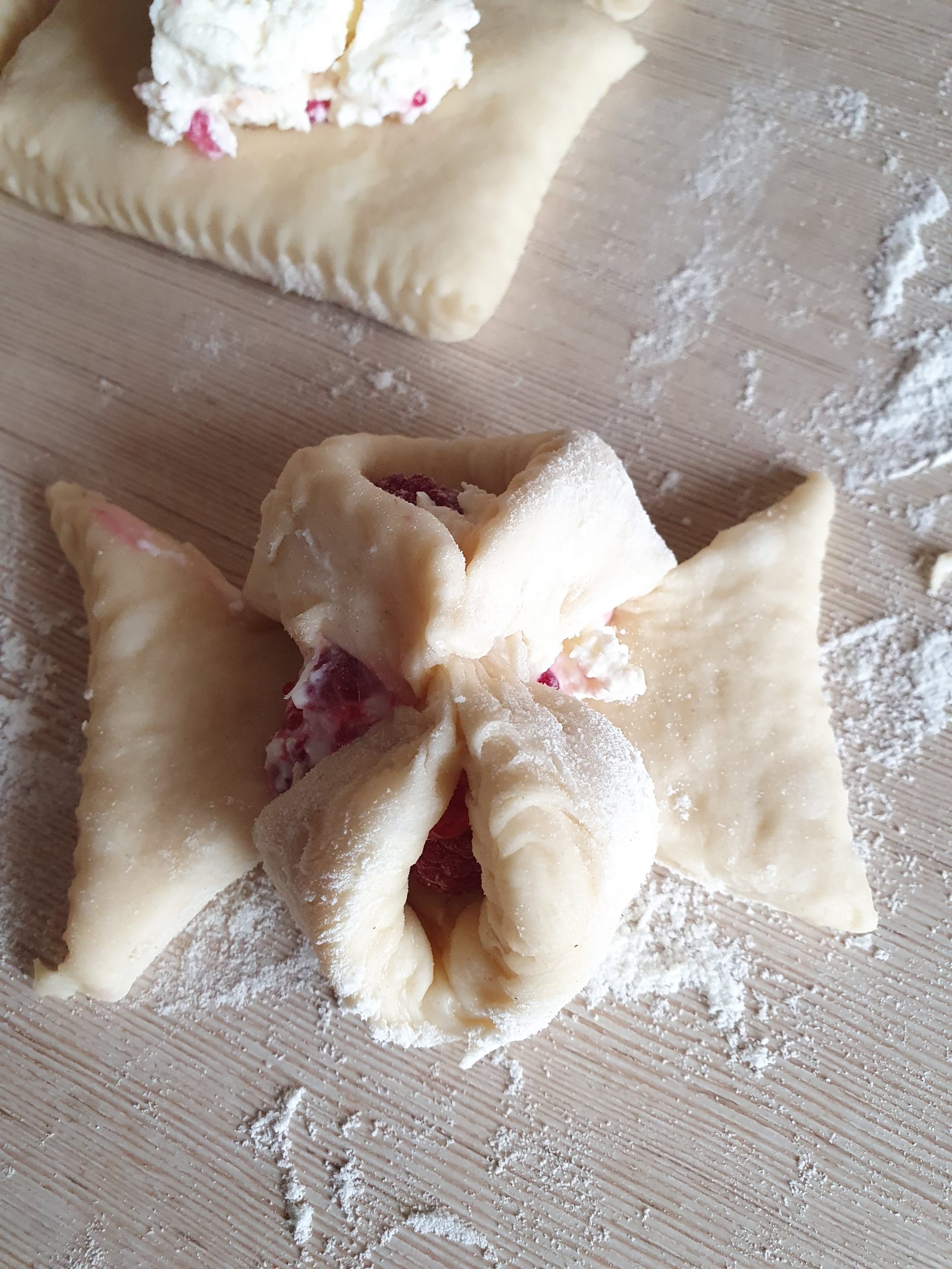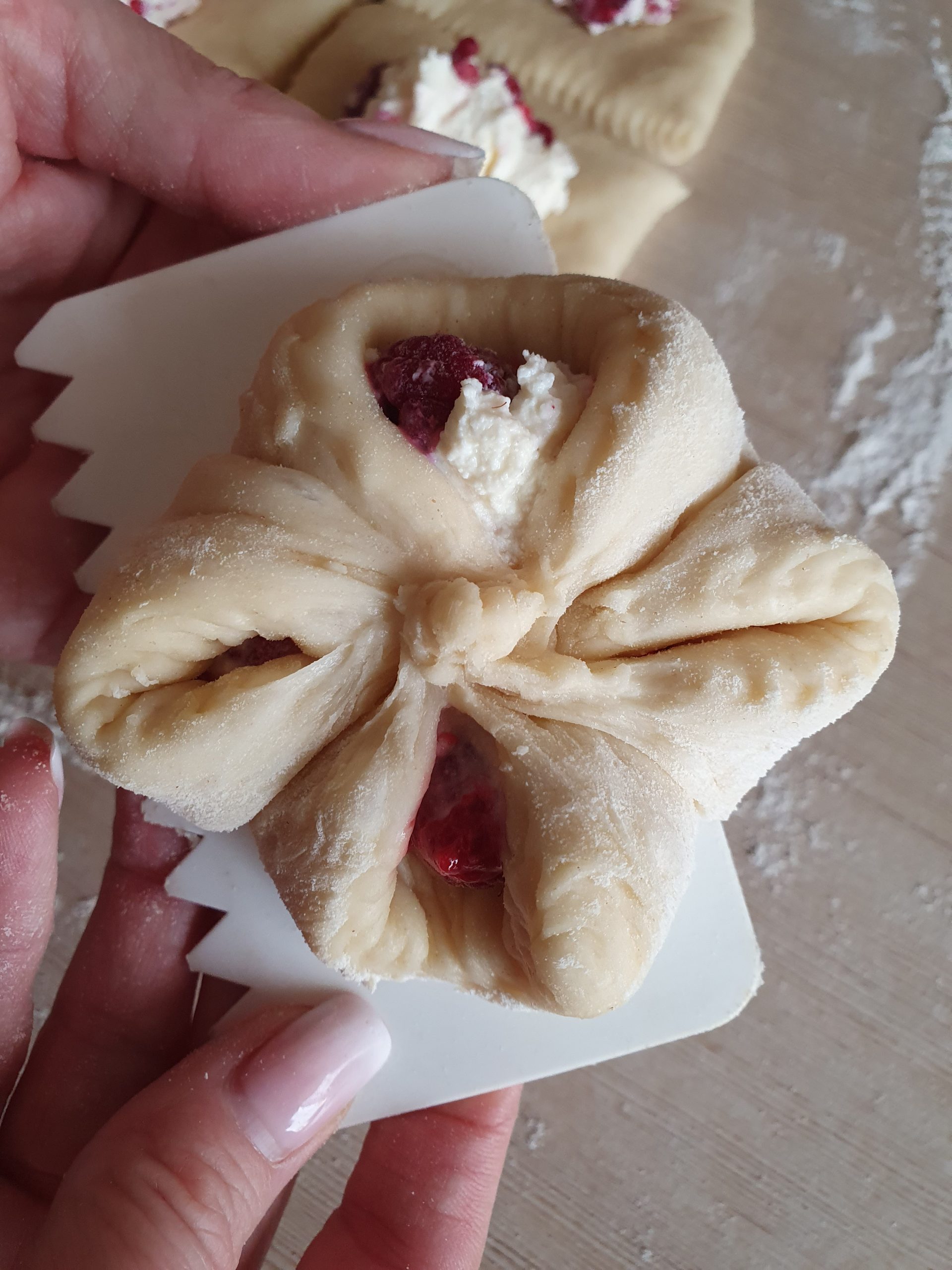 Złapać za rogi naciętego kawałka i skleić go na środku. Powtórzyć z każdą naciętą częścią. Dobrze zlepiać na środku (taki szczypas zakrętasem, precyzyjna robótka, cierpliwości:). Dałam jeszcze na środku małą kulkę z ciasta, dodatkowe wzmocnienie, by bułeczki nie rozkleiły się podczas pieczenia.