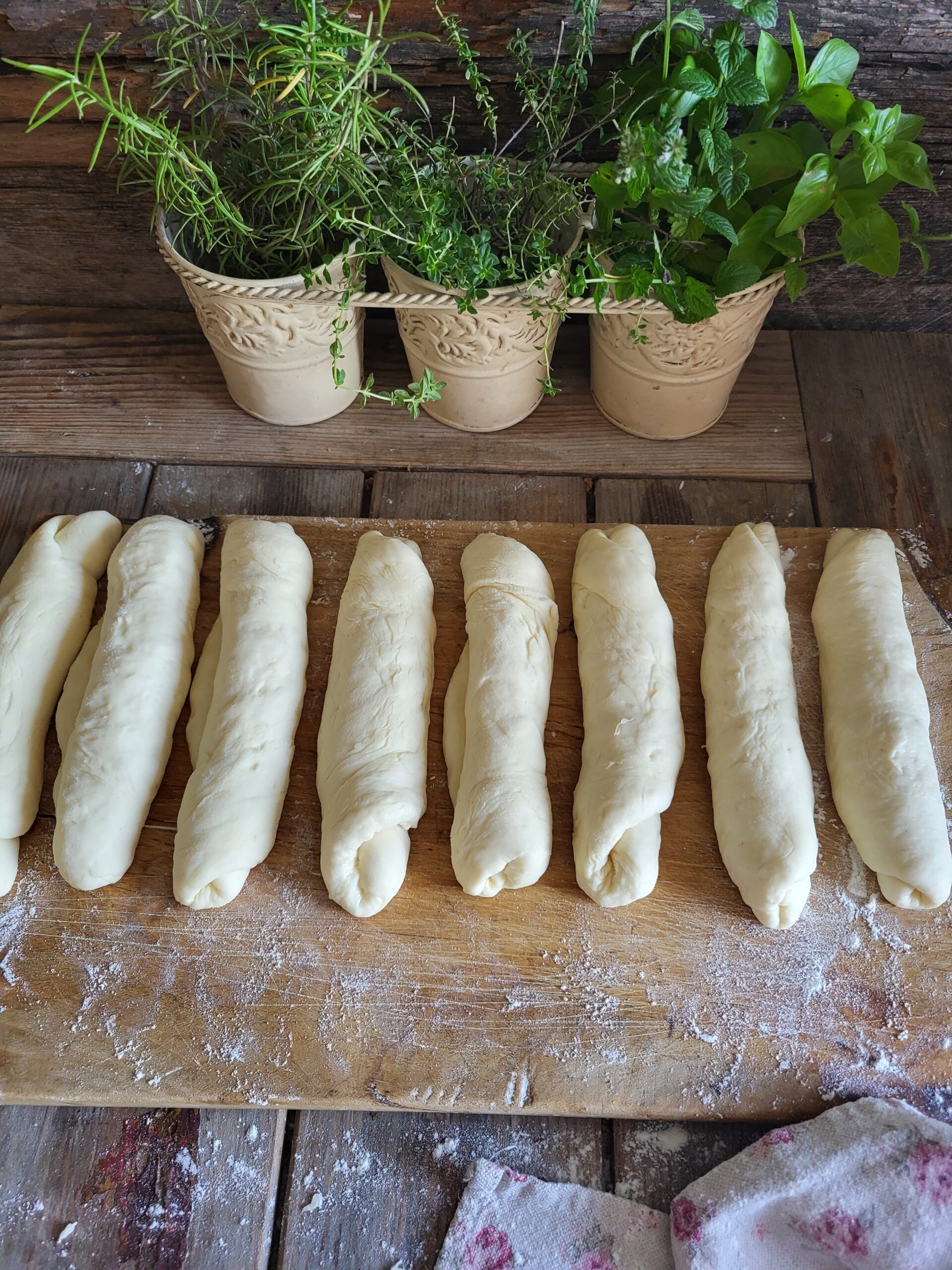 Zwinąć placuszki w podłużne ruloniki i ułożyć na podsypanym mąką blacie brzegiem do spodu. Końce paluchów lekko zlepić.