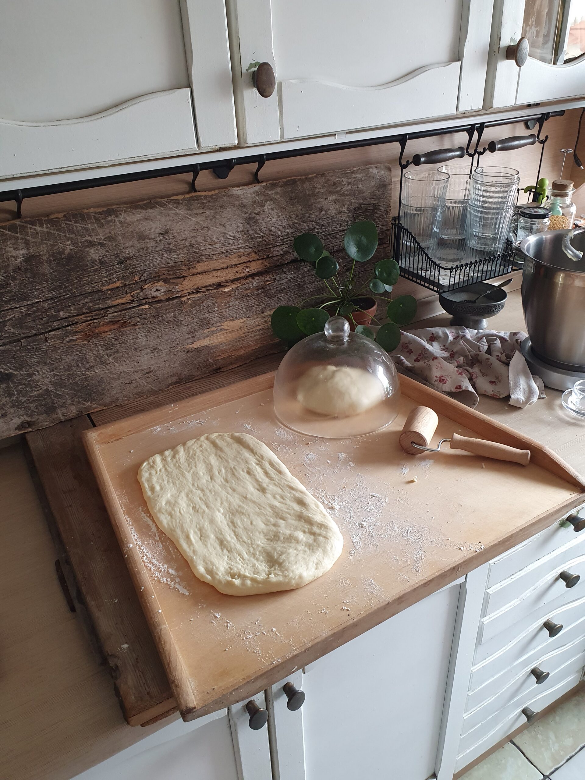Po wyrośnięciu, ciasto wyjąć z miski i podzielić na dwie części.
