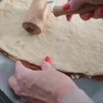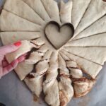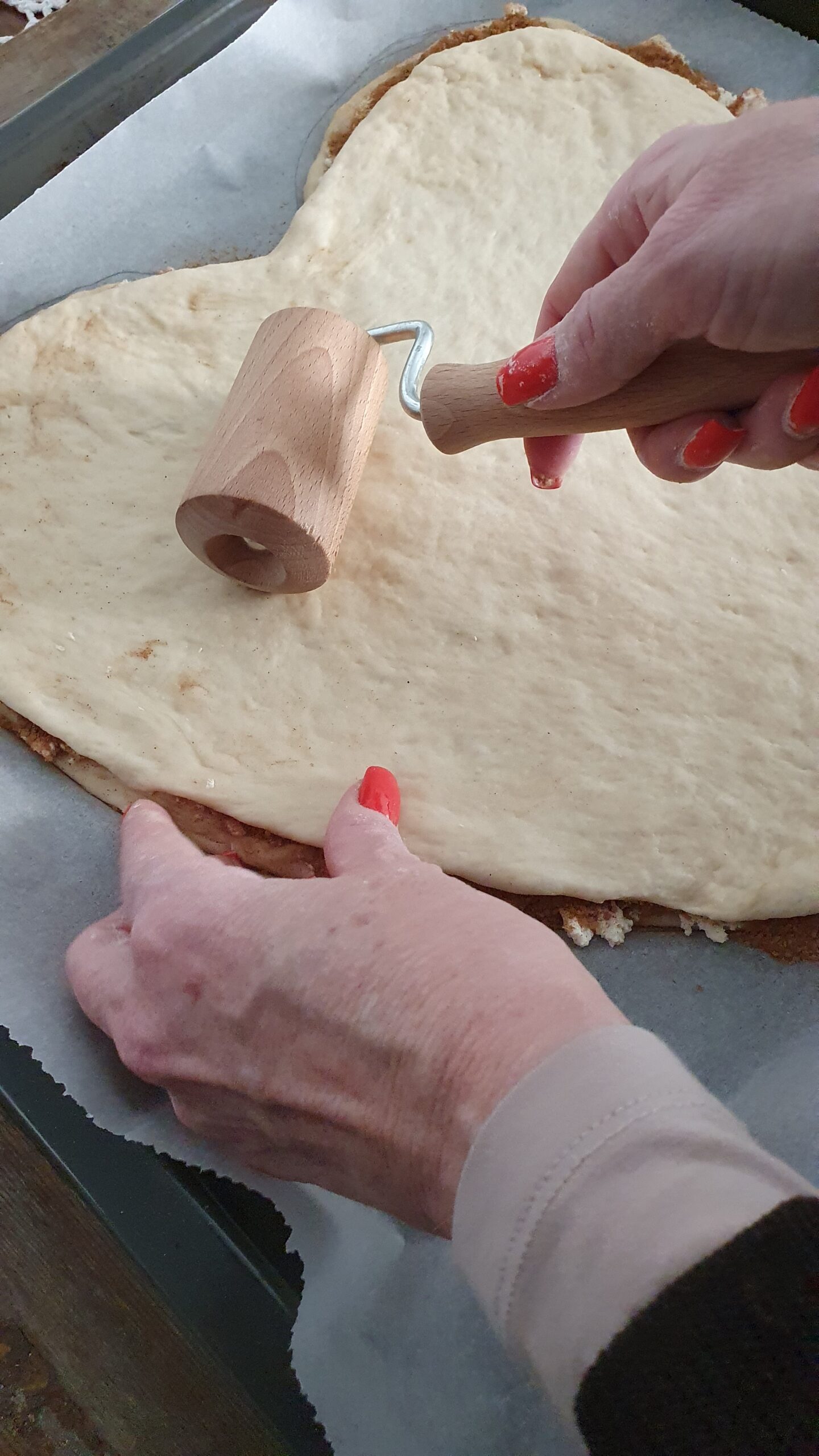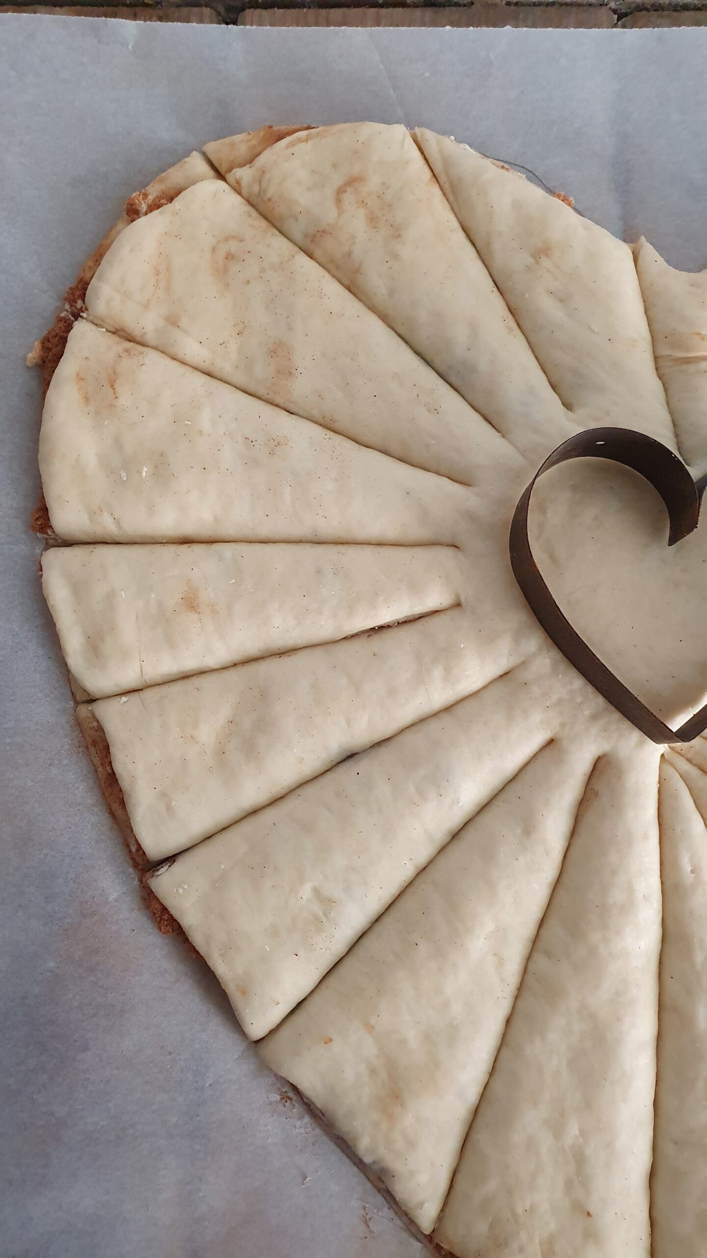 Nożem do pizzy lub zwykłym nożem nacinać od brzegu do serduszka/kółka 3 cm paski.