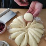 Z każdej części utoczyć kulkę – bułeczkę zawijając brzegi pod spód. Z bułeczki uformować dłonią placuszek o średnicy ok.10 cm.