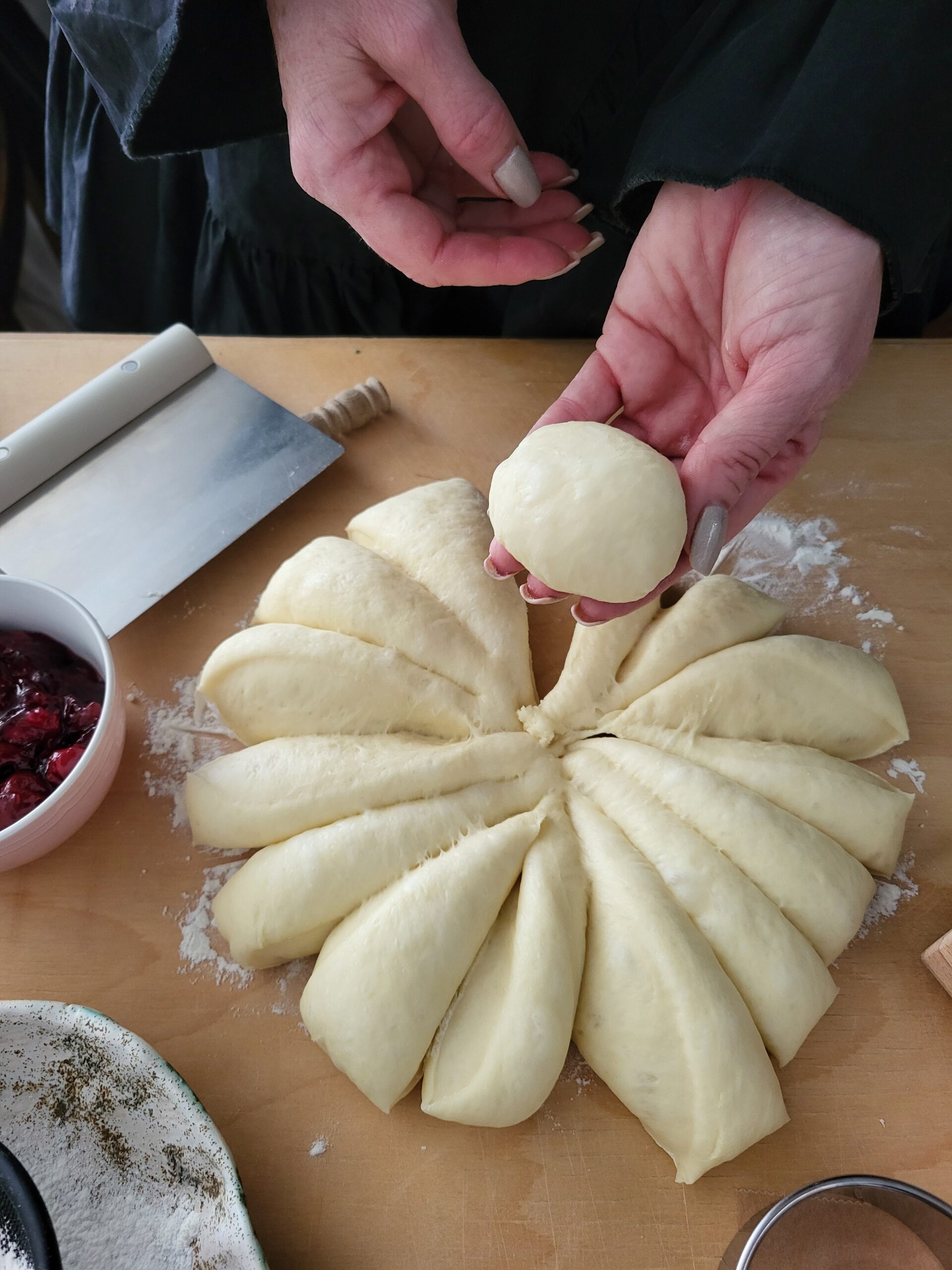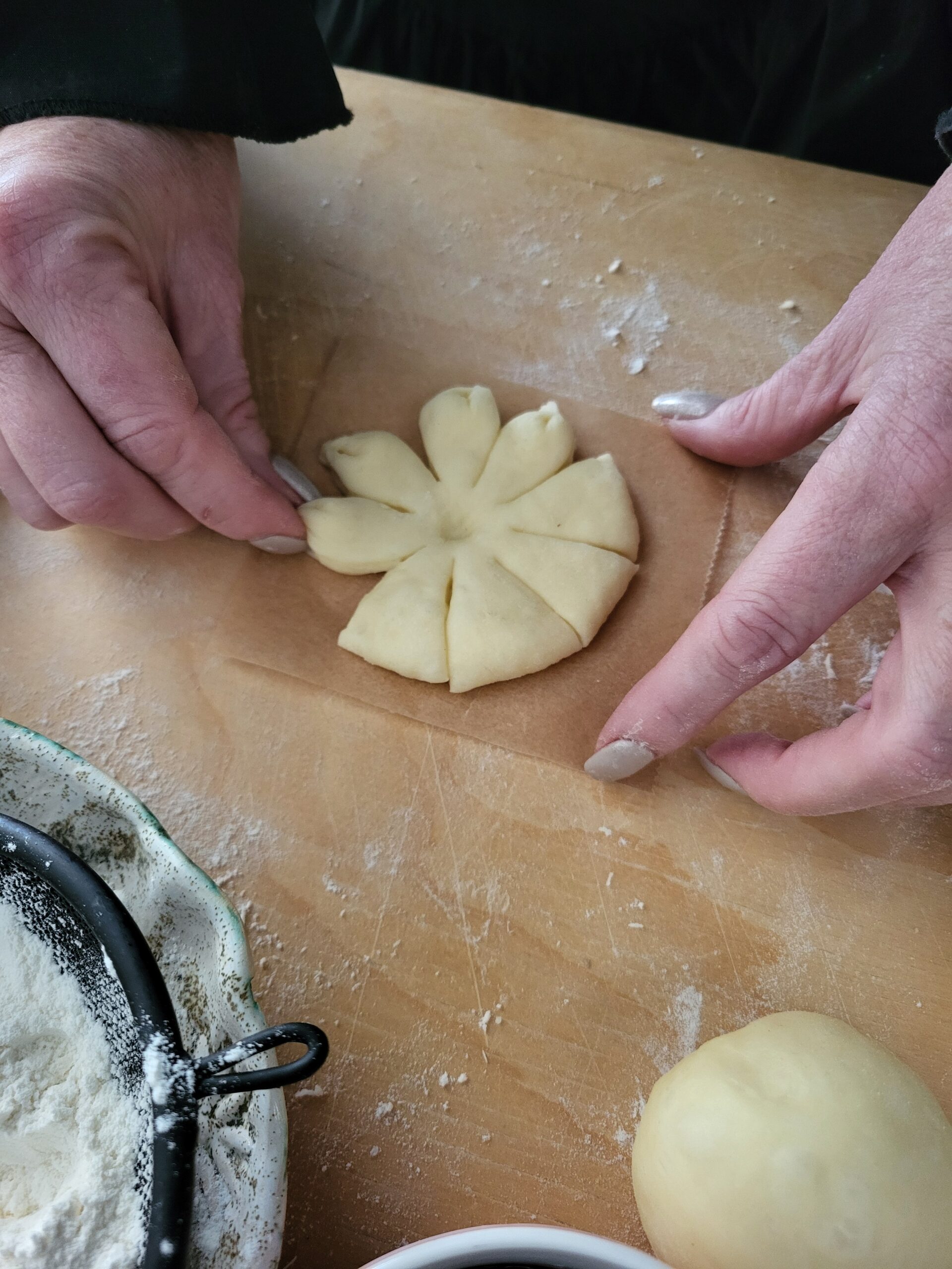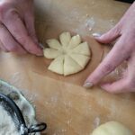 Palcami uformować brzegi “płatków”. Trochę się klei, można oprószyć palce mąką.