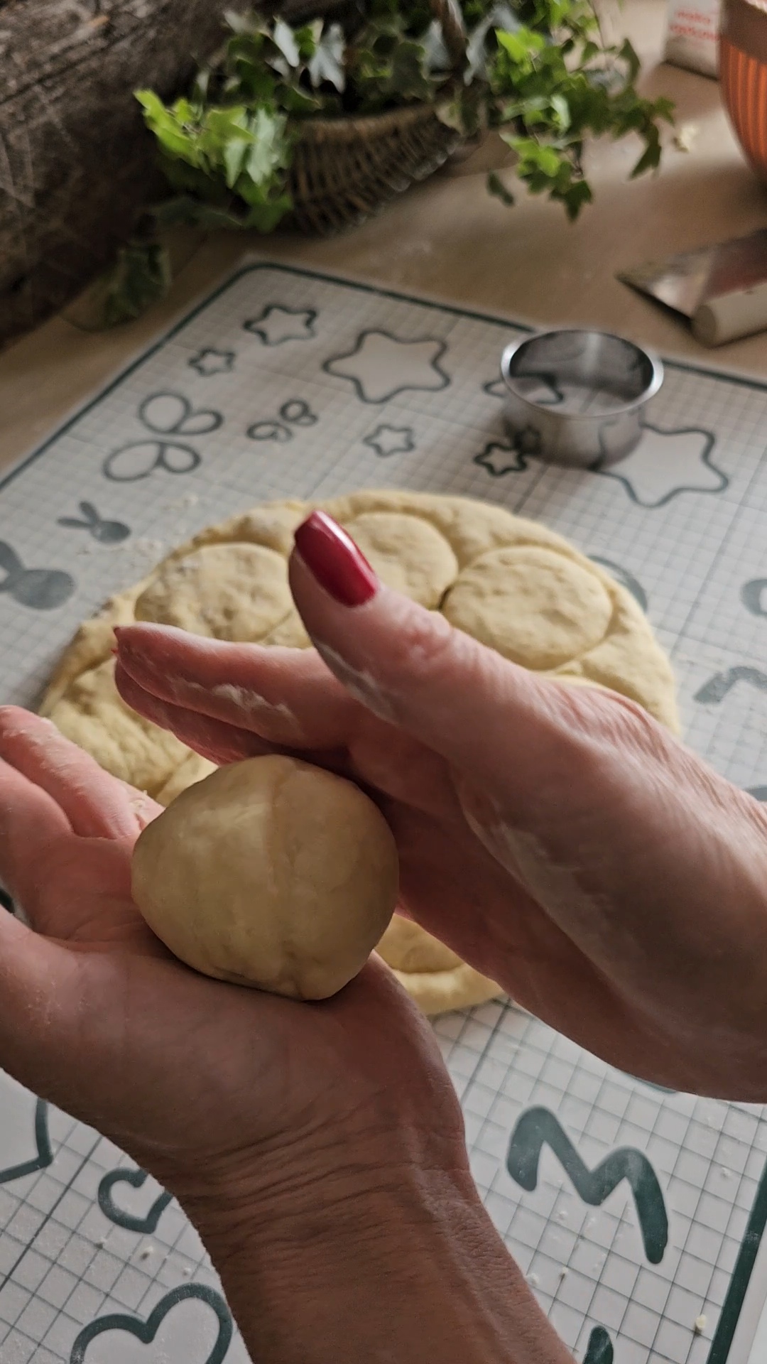 Z krążków uformować dłonią kulki i układać sklejeniem do dołu na podsypanym mąką blacie, lekko je spłaszczyć dłonią.