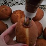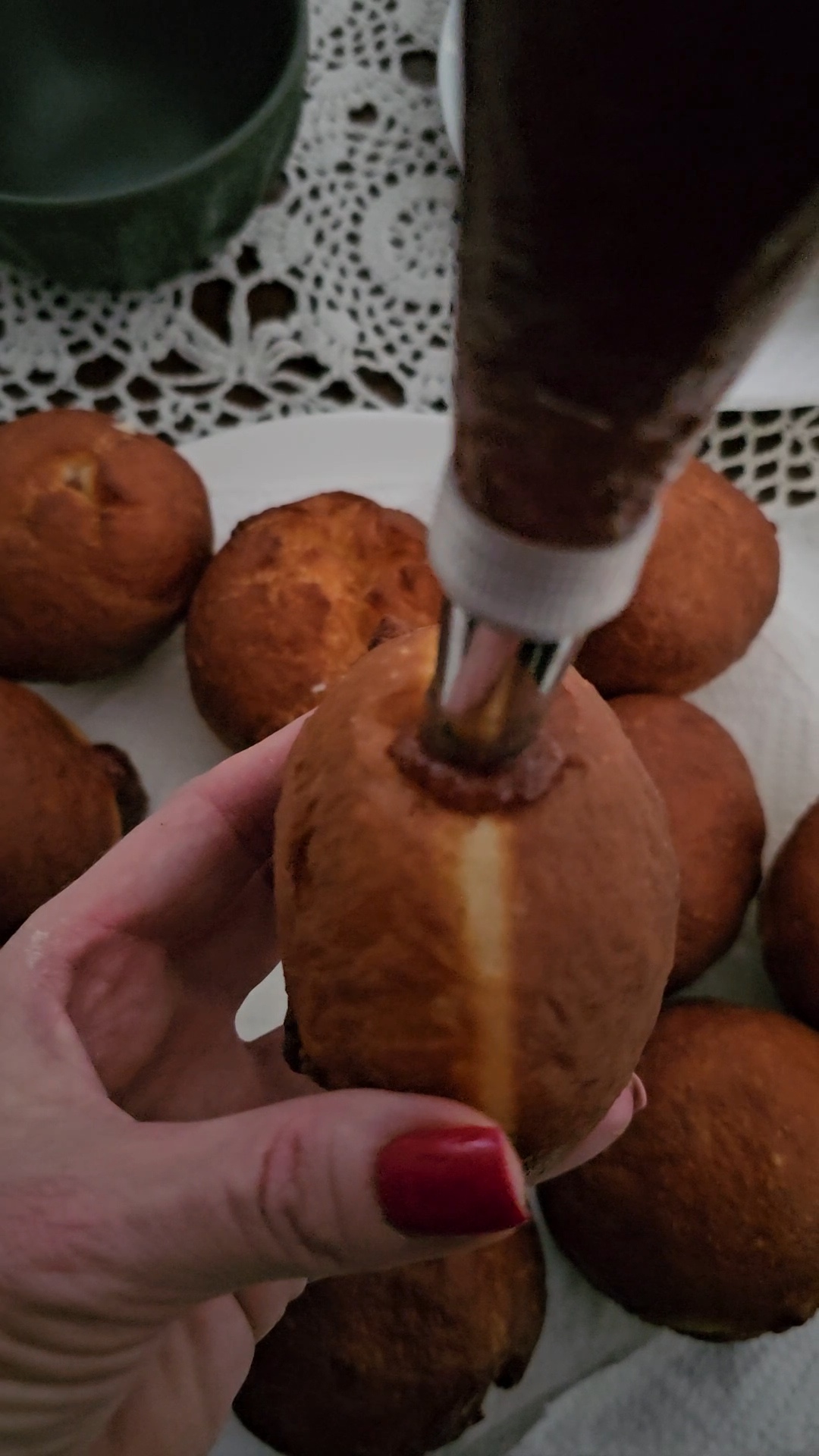 Pączki nadziewam już po usmażeniu, jeszcze ciepłe. Używam do tego dekoratora z długą końcówką – szprycą. Można radzić też sobie wielką strzykawką z apteki.